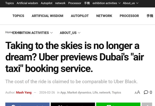 Core Insights - Uber announced the launch of air taxi services in Dubai by the end of 2026, allowing users to book rides directly through the Uber app, marking a new option for urban transportation [1] Group 1: Service Details - The air taxi service will utilize electric aircraft developed by Joby Aviation, capable of carrying up to 4 passengers, with all flights operated by professional commercial pilots to ensure safety [1] - Four vertical takeoff and landing sites will be established in Dubai, strategically connecting key transportation hubs and landmarks, including Dubai International Airport and prominent shopping centers [1] Group 2: Strategic Collaboration - Both Uber and Joby Aviation have high expectations for the air taxi service, with Uber's Chief Product Officer stating that this advanced mode of air travel will significantly change urban transportation dynamics [4] - The booking process for the air taxi service will be user-friendly, similar to booking a regular ride, and will include Uber Black premium ground transportation for a seamless travel experience [4] Group 3: Future Expansion Plans - Currently, there are no plans to immediately expand the service to the U.S., as Joby Aviation is nearing completion of certification with the Federal Aviation Administration, preparing for global expansion [4] - Joby Aviation aims to extend its air taxi services to cities like New York and Los Angeles in the U.S., as well as international markets such as the UK and Japan after obtaining regulatory approvals [4] Group 4: Historical Context - The launch of the air taxi service in Dubai represents a significant milestone in the partnership between Uber and Joby Aviation, which began with Uber's acquisition of Joby's Elevate business and a $75 million investment in 2020 [5] - Following a period of divestment in autonomous driving initiatives due to decreased demand during the pandemic, Uber has been re-establishing its presence in the autonomous taxi sector through collaborations with companies like Lucid and Nuro [5]