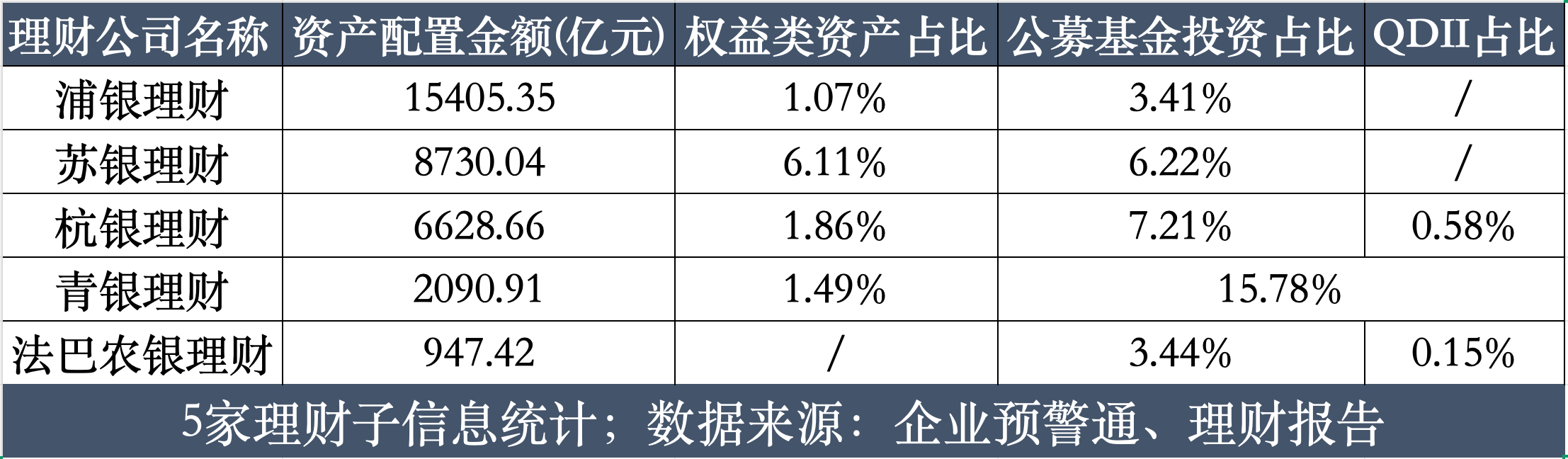 随着宏观流动性宽松的基调仍在延续,存款利率的连番下行深刻重塑着国内居民的资产负债表。过去几年里,保本保息的刚兑信仰随宏观周期切换逐渐退 潮,当大额存单利率甚至无法企及部分通胀指标时,海量资金被迫寻找新的栖息地。 这场被称为"存款搬家"的财富大迁徙,构成了当下大资管行业最核心的增量来源。 银行理财子公司作为脱胎于商业银行的财富管理中枢,自然成为了这股巨量资金溢出的第一承接池。 尽管2025年的A股走出了温和的"慢牛"行情、债市则呈现出周期的震荡与波动,但从样本机构的产品结构来看,固收类产品的占比依然呈现出压倒性的绝对 优势。 | 理财公司名称 资产配置金额(亿元) 权益; | | | --- | --- | | 浦银理财 | 15405.35 | | 苏银理财 | 8730.04 | | 杭银理财 | 6628.66 | | 青银理财 | 2090.91 | | 法巴农银理财 | 947.42 | | | 5分期时了,但在上,新城市 | 信风注意到,上述理财子中,法巴农银理财固收类产品占比达100%,青银理财固收占比达99.98%,浦银理财占比达99.91%,杭银理财也维持在99.22%的高 位;资产端,浦银理 ...