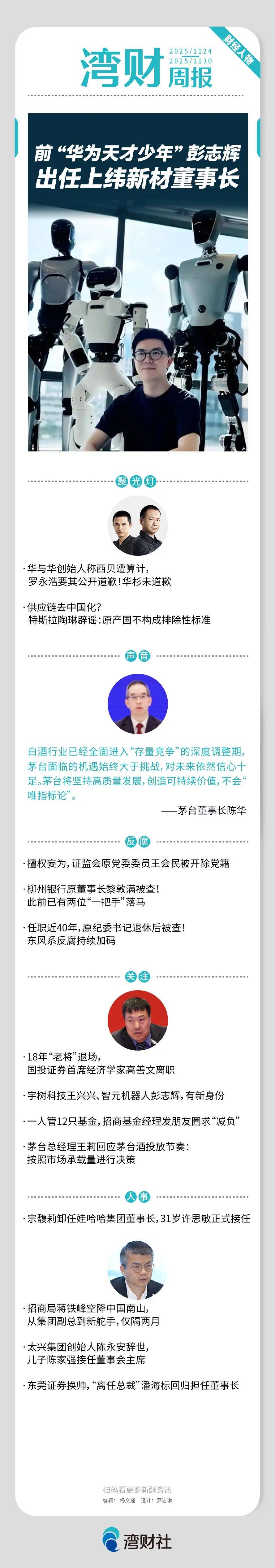 本文自南都·湾财社。 野 平安 · 华与华创始人称西贝遭算计, 罗永浩要其公开道歉!华杉未道歉 · 供应链去中国化? 特斯拉陶琳辟谣:原产国不构成排除性标准 白酒行业已经全面进入"存量竞争"的深度调整期, 茅台面临的机遇始终大于挑战,对未来依然信心十 足。茅台将坚持高质量发展,创造可持续价值,不会" 唯指标论"。 茅台董事长陈华 · 擅权妄为,证监会原党委委员王会民被开除党籍 · 柳州银行原董事长黎敦满被查! 此前已有两位"一把手"落马 · 任职近40年,原纪委书记退休后被查! 东风系反腐持续加码 · 18年"老将"退场, 国投证券首席经济学家高善文离职 · 宇树科技王兴兴、智元机器人彭志辉,有新身份 ·一人管12只基金,招商基金经理发朋友圈求"减负" ·茅台总经理王莉回应茅台酒投放节奏: 按照市场承载量进行决策 【头条】 前"华为天才少年",任上纬新材董事长 11月25日,上纬新材发布公告称,董事会会议选举彭志辉为第四届董事会董事长,田华为首席执行官(CEO),并担任法定代 表人。彭志辉的网名为"稚晖君",在B站上拥有283.6万粉丝,曾被称为"华为天才少年",其目前是智元机器人的联合创始人、 总裁兼CTO ...