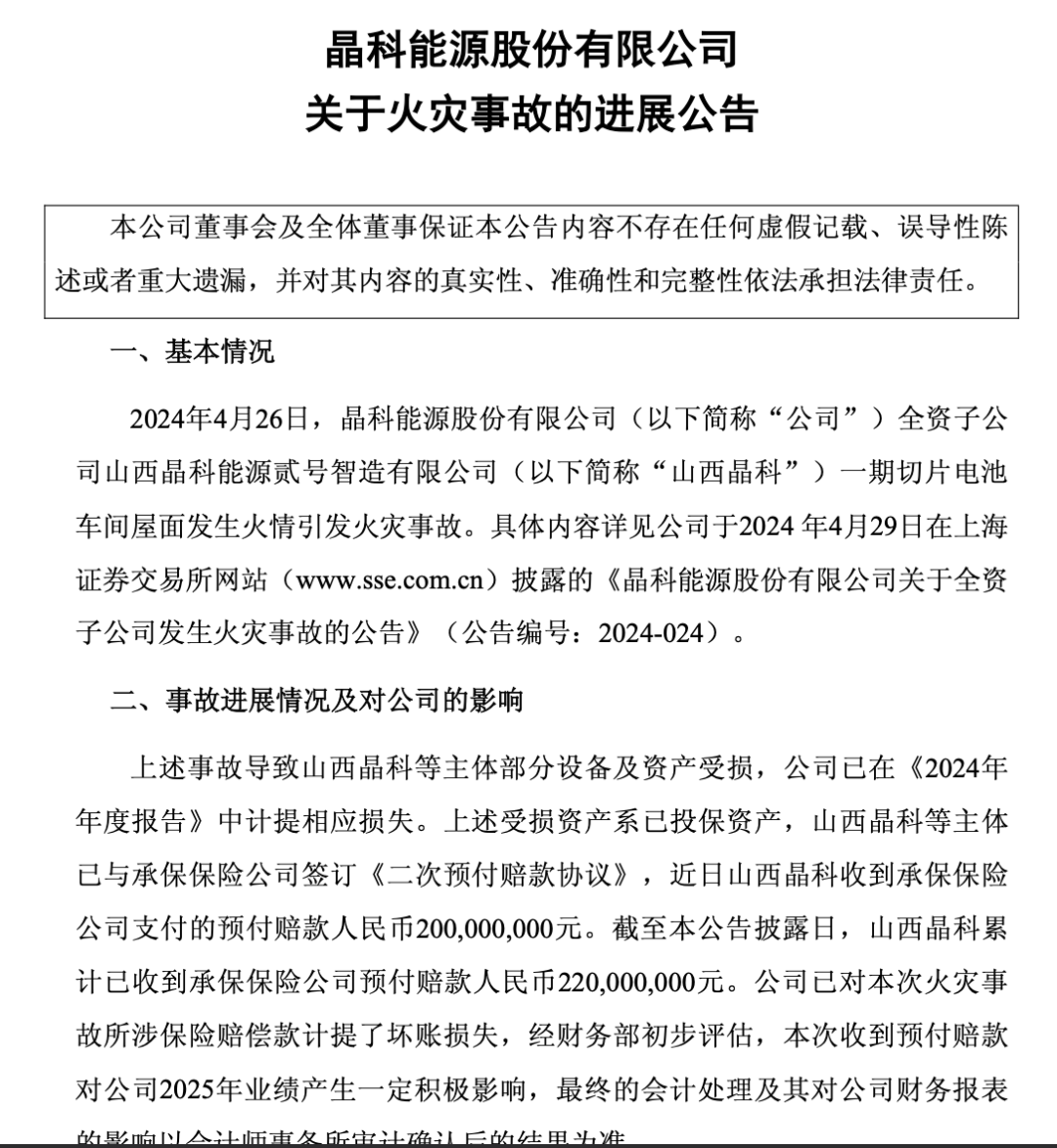 每经编辑|程鹏 11月30日,全球最大的光伏组件公司晶科能源(688223)发布公告,披露关于2024年4月26日全资子公司山西晶科能源贰号智造有限公司(下称"山西晶 科")发生的火灾事故的进展情况。 公告显示,该事故导致部分设备及资产受损,公司已在2024年年度报告中计提相应损失。山西晶科与承保保险公司签订了《二次预付赔款协议》,近日已 收到预付赔款2亿元,截至本公告披露日,累计收到预付赔款2.2亿元。 公司表示,已对本次火灾事故所涉保险赔偿款计提了坏账损失,收到的预付赔款将对2025年业绩产生一定积极影响,最终的会计处理及其对财务报表的影 响需待会计师事务所审计确认。 需要注意的是,此预付赔款并不代表承保公司认可事故属于保险责任,是否构成保险责任仍需依据法律法规、保险合同及事故调查报告等进行确认 2024年,晶科能源营业收入为924.71亿元,同比下降22.08%;归母净利润为9892.76万元,同比下降98.67%。 今年前三季度,晶科能源营业收入为479.86亿元,同比下降33.14%;归母净利润为-39.20亿元,同比下降422.67%。公司表示,期内亏损主要系光伏市场竞 争加剧,光伏产品价格持续下 ...