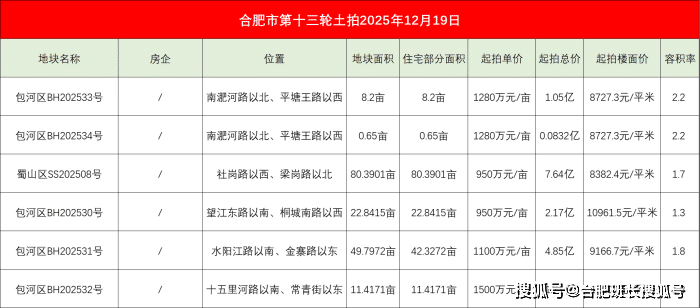 近日,合肥陆续发布国有建设用地使用权出让公告,计划于12月19日出让包河、蜀山的6宗居住用地。 (暂定,后续也许还会新增地块) 等12月的土拍结束后,时间也将步入2026年,那12月、2026年上半年有哪些纯新房可以买?我们一起来 看看。 | | | | 合肥市第十三轮土拍2025年12月19日 | | | | | | | --- | --- | --- | --- | --- | --- | --- | --- | --- | | 地块名称 | 房企 | 位置 | 地块面积 | 住宅部分面积 | 起拍单价 | 起拍总价 | 起拍楼面价 | 容积率 | | 包河区BH202533号 | 1 | 南泥河路以北、平塘王路以西 | 82亩 | 8.2亩 | 1280万元/亩 | 1.05 亿 | 8727.3元/平米 | 2.2 | | 包河区BH202534号 | 1 | 南泥河路以北、平塘王路以西 | 0.65亩 | 0.65亩 | 1280万元/亩 | 0.0832亿 | 8727.3元/平米 | 2.2 | | 蜀山区SS202508号 | 1 | 社岗路以西、梁岗路以北 | 80.3901亩 | 80.3 ...