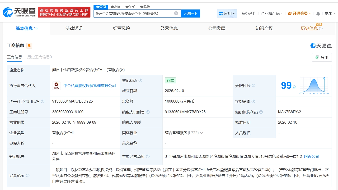 | | | 都在用的商业查询工具 | 夏公司 童老板 童关系 音风险 | | | | | | --- | --- | --- | --- | --- | --- | --- | --- | | | | 国家中小企业发展子基金旗下机构 | 湖州中金启新股权投资合伙企业(有限合伙) | × | 天眼一下 | 脂 应用 ▼ | 商务合作 : | | | 基本信息 16 | 法律诉讼 | 经营风险 | 经营信息 | | 公司发展 | 知诚 | | | 合伙人信息 16 ② ● 品股权结构 | | | | | | Q点 | | 序号 | | | 合伙人名称 | | | 出资比例÷ | 认缴出资额 | | 1 | FAV 其全 | 晚 同公路更级资有限公司 品 国有独资 | | | | | | | 2 | 创新 | 湖州市创新创业投资有限公司 品 | | | | | | | | | 国有独资 | | | | | | | 3 | | 湖州市交通投资集团有限公司 富 间 市管国企 | | | | | | | 4 | 协兴 | 湖州协兴投资发展有限公司 品 国有独资 | | | | | | | 5 | | 湖州市南太湖科创投资 ...