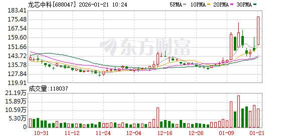 1月21日盘中科创板股龙芯中科涨停,截至09:40,股价报177.72元,成交18.38亿元,换手率2.69%,振 幅16.66%。 科创板个股中,截至发稿上涨的共有428只,涨幅在5%以上的共有21只,涨幅较高的有龙芯中科、芯碁 微装、天智航-U等,分别上涨20.00%、11.56%、10.16%,下跌的有160只,跌幅较大的有凯因科技、步 科股份、颀中科技,分别下跌13.65%、5.19%、4.26%。 资金面上,龙芯中科上一交易日主力资金净流入1.45亿元,近5日净流入2.64亿元。 融资融券数据显示,该股最新(1月20日)两融余额为11.09亿元,其中,融资余额为11.05亿元,较上一 个交易日减少4040.67万元,降幅为3.53%;融券余额为325.09万元,较上一个交易日增加0.71万元,增 幅为0.22%。近10日两融余额合计增加1.72亿元,增幅为18.41%,其间融资余额增长18.45%,融券余额 增长5.66%。(数据宝) (文章来源:证券时报网) ...