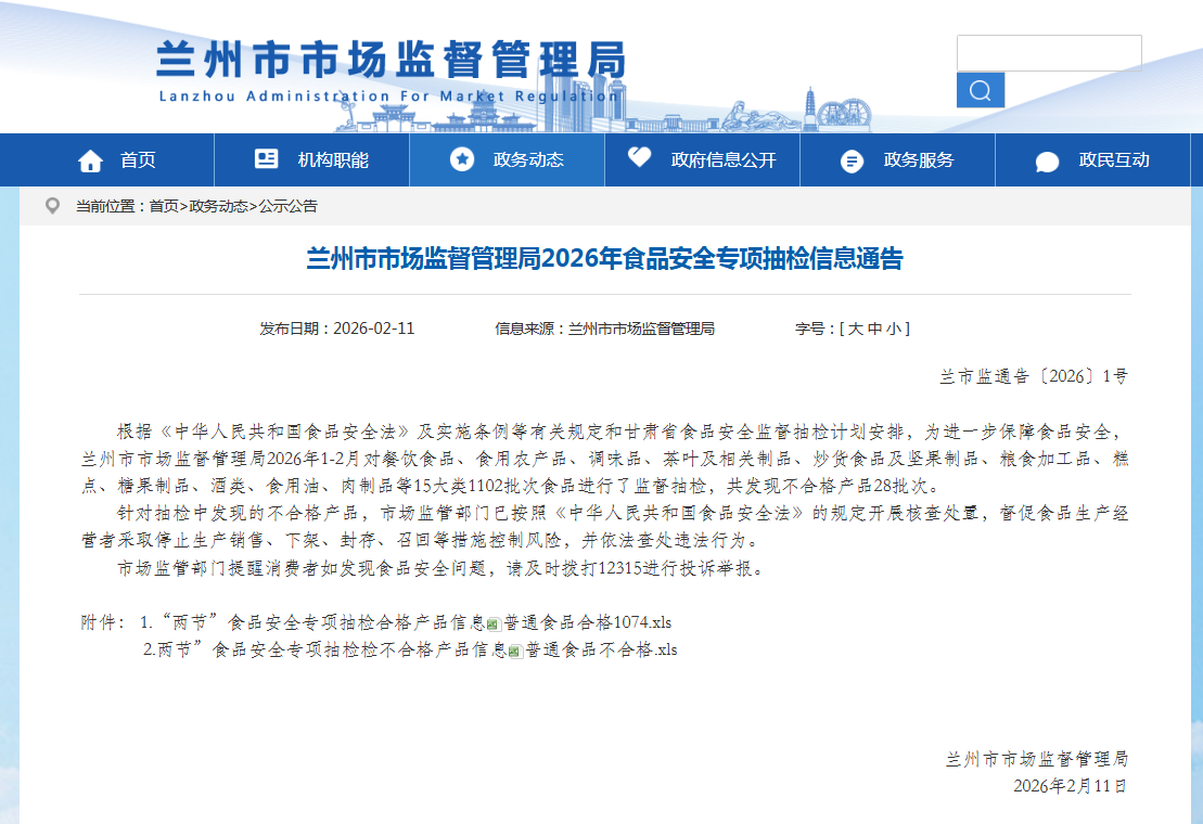 兰州市市场监督管理局2026年食品安全专项抽检信息通告