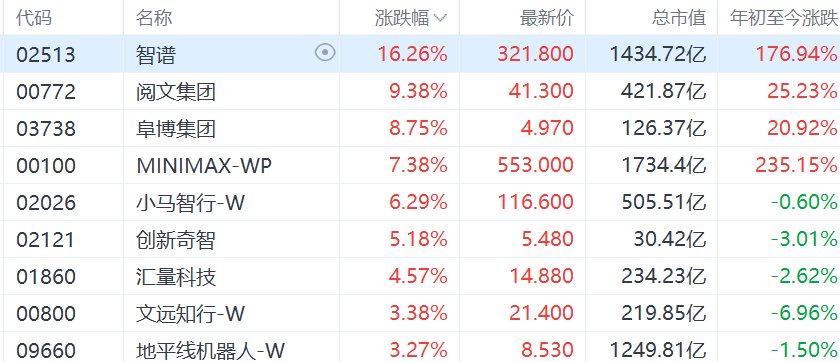 消息面上,近日,一款名为Seedance2.0的AI视频生成模型再度刷屏海内外互联网。开源证券发布研报 称,字节跳动在即梦平台上线Seedance2.0视频生成模型,引发AI产业界广泛测评与讨论,且实测效果 惊艳。其支持文字、图片、视频、音频等各类素材输入,并生成视频,在自运镜和分运镜、全方位多模 态思考、音画同步生成、多镜头叙事能力等几个关键能力上实现突破。 港股异动丨阅文集团大涨近10% CEO阐述三大战略重心 阅文集团(00772.HK)因行使购股权发行600股 | 代码 | 名称 | | 涨跌幅 √ | 最新价 | 总市值 | 年初至今涨跌 | | --- | --- | --- | --- | --- | --- | --- | | 02513 | 智谱 | 0 | 16.26% | 321.800 | 1434.72亿 | 176.94% | | 00772 | 阅文集团 | | 9.38% | 41.300 | 421.87亿 | 25.23% | | 03738 | 阜博集团 | | 8.75% | 4.970 | 126.37亿 | 20.92% | | 00100 | MINIMAX-WP ...