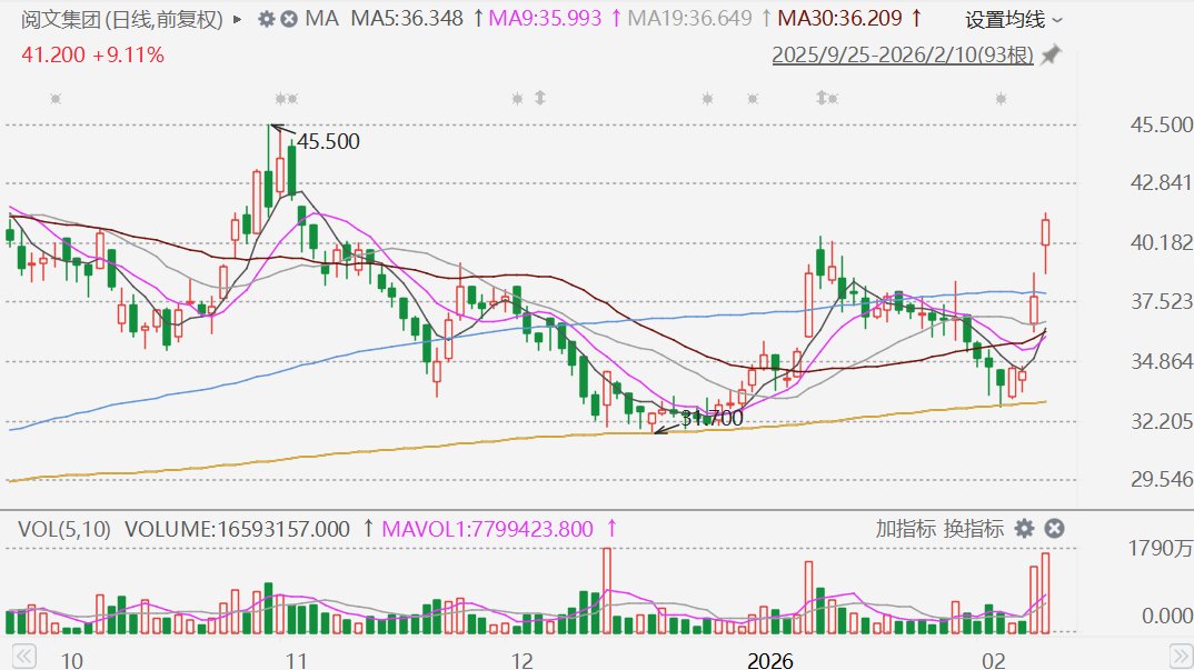 阅文集团(0772.HK)盘中大涨近10%至41.5港元,为连续第二日放量上涨,股价创2025年11月5日以来新 高。消息面上,首席执行官兼总裁侯晓楠发布春节内部信,明确将"长青内容、IP+AI、全球化"作为今 年三大核心战略方向。 一是打造"长青内容",支持核心作家与优势品类,并积极培育新生力量与多元题材,同时加快开发影视 续作与精品动画,推动短剧与漫剧向精品化升级,并透过衍生品与潮玩等多元载体,让IP深度融入用户 生活,持续培育长青IP。 相关事件 港股异动丨阅文集团大涨近10% CEO阐述三大战略重心 阅文集团(00772.HK)因行使购股权发行600股 建构"IP+AI"创作生态方面,侯晓楠表示,AI发展愈快,原创内容就愈珍贵,好故事的价值将被前所未 有地放大,阅文海量IP迎来视觉化的新机遇。阅文将在内容孵化、精品内容制作、IP开发、产业全球化 等环节全面拥抱AI,全力布置AI漫剧等新场景,提升IP的开发效率与价值空间。 三是建设全球化的长期引擎,加速推进多语种出海,在拓展市场的同时深耕重点区域,集中力量打造具 有国际影响力的标杆IP。 ...