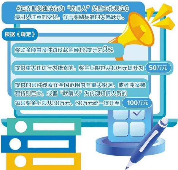 "吹哨人"制度是成熟资本市场打击违法违规行为的重要机制之一。2014年6月,证监会发布实施《证券 期货违法违规行为举报工作暂行规定》,设立重大违法线索有奖举报制度。此次将制度名称修改为《证 券期货违法行为"吹哨人"奖励工作规定》,以更好体现"吹哨人"正义担当精神,强调专业特点,突出激 励导向。 新规最引人注意的变化,在于奖励标准的大幅跃升。根据《规定》,奖励金额由案件罚没款金额1%提 升为3%。提供重大违法行为线索的,奖金上限也从10万元提升为50万元。提供的案件线索在全国范围 内有重大影响,或者涉案数额特别巨大,或者"吹哨人"为内部知情人员的,每案奖金上限从30万元、60 万元统一提升至100万元。 奖励条件也同步完善,《规定》将严重破坏证券期货市场秩序,严重危害金融安全,严重侵害投资者合 法权益的重大案件纳入奖励案件范围。可奖励案件条件从罚没款金额10万元提升为100万元。按要求补 充相关材料信息的匿名"吹哨人",以及在违法行为中起次要或者辅助作用的"吹哨人",符合条件的也可 予以奖励。 "奖励标准大幅提高,能够激励更多人站出来,提供关键线索,提升证券市场违法行为的发现概率。"南 开大学金融发展研究院院长 ...