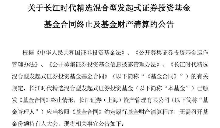 每经编辑|彭水萍 记者注意到,截至2025年11月28日,该基金A类份额净值仅有0.6158元,相当于成立近3年时间,亏损达38.42%。 值得一提的是,该基金在刚成立时,公司自购了1亿元,按照目前的净值估算,浮亏达3842万元。 3年亏38.42% 12月1日,长江证券(上海)资产管理有限公司(以下简称长江证券资管)公告,截至2025年11月30日日终,长江时代精选混合发起 基金资产净值低于2亿元,已触发《基金合同》约定的自动终止情形。 根据相关约定,基金最后运作日为2025年11月30日。自2025年12月1日起,基金进入财产清算程序。 近日,长江证券(上海)资产管理有限公司发布公告称,长江时代精选混合发起基金因触发基金合同约定的自动终止情形,自2025年 12月1日起,进入财产清算程序。 这种频繁的调仓换股,不仅没能踩准市场节奏,反而是连续多个季度跑输业绩比较基准。 基金经理在2023年报中表示:"将认真总结并吸取2023年的教训,积极应对市场变化。始终保持冷静客观,在持仓结构上不断优化, 不拘泥于死板投资范式。" 到了2024年,基金经理继续频繁调仓换股,2024年一季度末的前十大重仓股,在2024年 ...