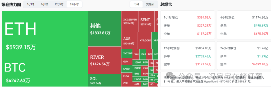 BTC 一夜过后黄金新高,白银跟涨,以前还能琢磨金包银,现在怕是难了。币圈昨晚下探后横盘,今天周五警惕夜盘波动。别猜涨跌,轻仓或远挂单! 过去24小时全网共有107,859人被被爆仓,爆仓总金额为$1.96亿美元,多单爆仓1.29亿美元,空单爆仓6699.40万美元。 | 爆仓热力图 | 1小时 4小时 | 12小时 24小时 | | | 而神 | 交易所 | 总爆仓 | | | | | --- | --- | --- | --- | --- | --- | --- | --- | --- | --- | --- | | | | | 其他 | $559.477 | | SENT $525.24万 | 1小时爆仓 多重 | $384.52万 $227.29万 | 4小时爆仓 ਣੇ ਛ | $1174.60万 $498.69万 | | | | | $1833.81万 | | | | | | | $675.90万 | | | | | | AXS $434.887 | | | 空前 | $157.23万 | 空单 | | | $5939.15万 | | | | | | | 12小时爆仓 器用 | $5854.05万 ...