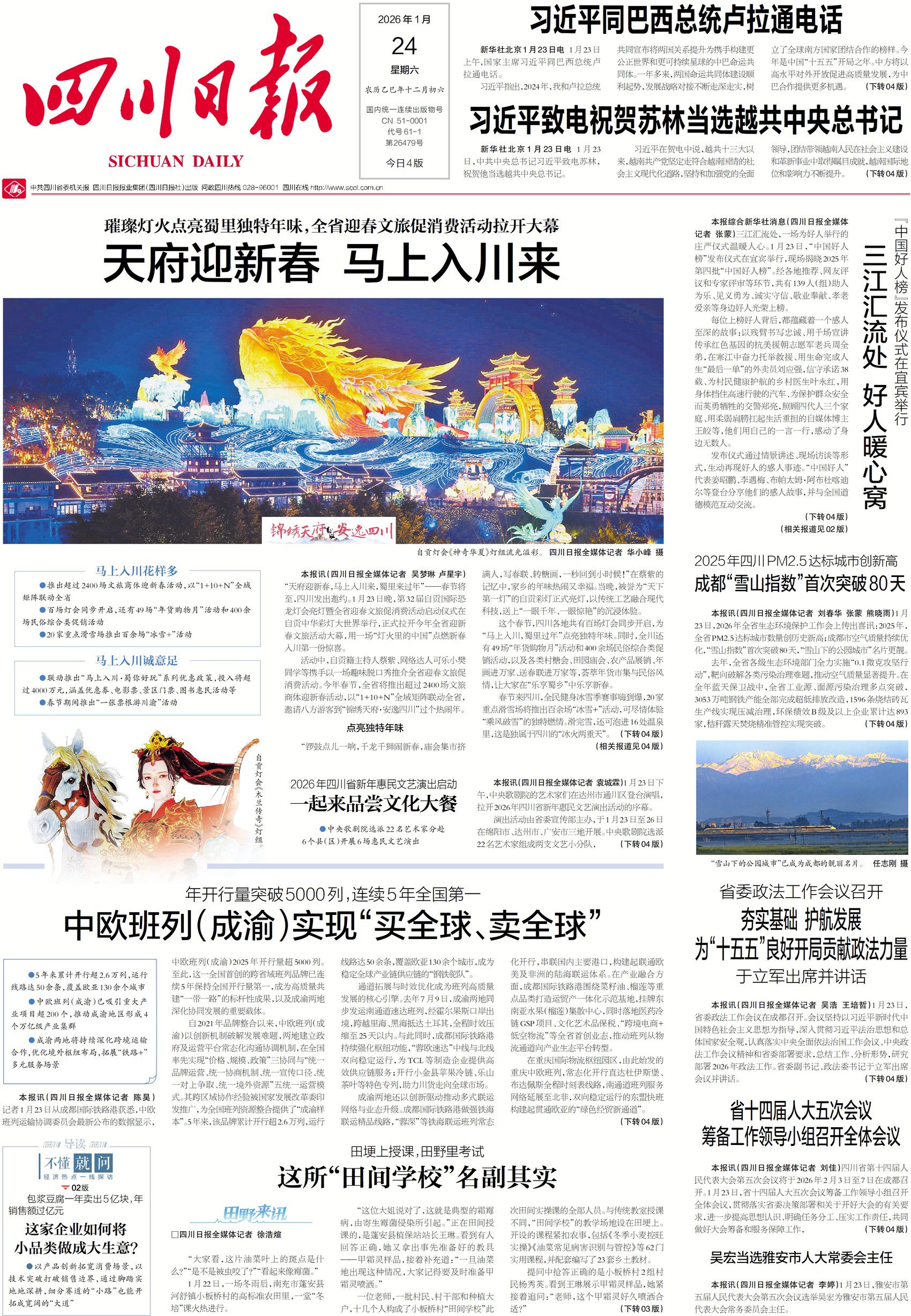 转自:四川日报 春节将至,四川喊你"马上入川,蜀里过年"——1月23日晚,第32届自贡国际恐龙灯会亮灯暨全省迎春文旅促消费活动启动仪式在自贡中华彩灯大世界举 行,正式拉开今年四川迎新春文旅活动的大幕,用一场"灯火里的中国"点燃新春入川第一份惊喜。今年春节,四川将推出超过2400场文旅商体活动,邀请八 方游客到"锦绣天府·安逸四川"过个热闹年。快看今天的一版、四版,有新春礼包,有好看的灯会。 起来品尝文化大餐 ●以产品创新拓宽消费场景,以 技术突破打破销售边界,通过脚踏实 地地深耕,细分赛道的"小路"也能开 拓成宽阔的"大道" 中欧班列(成渝)2025年开行量超 5000列。 至此,这一全国首创的跨省域班列品牌已连 续5年保持全国开行量第一,成为高质量共 建"一带一路"的标杆性成果,以及成渝两地 深化协同发展的重要载体。 ●中央歌剧院选派22名艺术家分赴 6个县(区)开展6场惠民文艺演出 午,中央歌剧院的艺术家们在达 拉开2026年四川省新年惠民文艺 演出活动由省委宣传部主办 在绵阳市、达州市、广安市三地3 22 名艺术家组成两支文艺小分队 年开行量突破5000列,连续5年全国第一 中欧班列(成渝)实现"买全球 ...