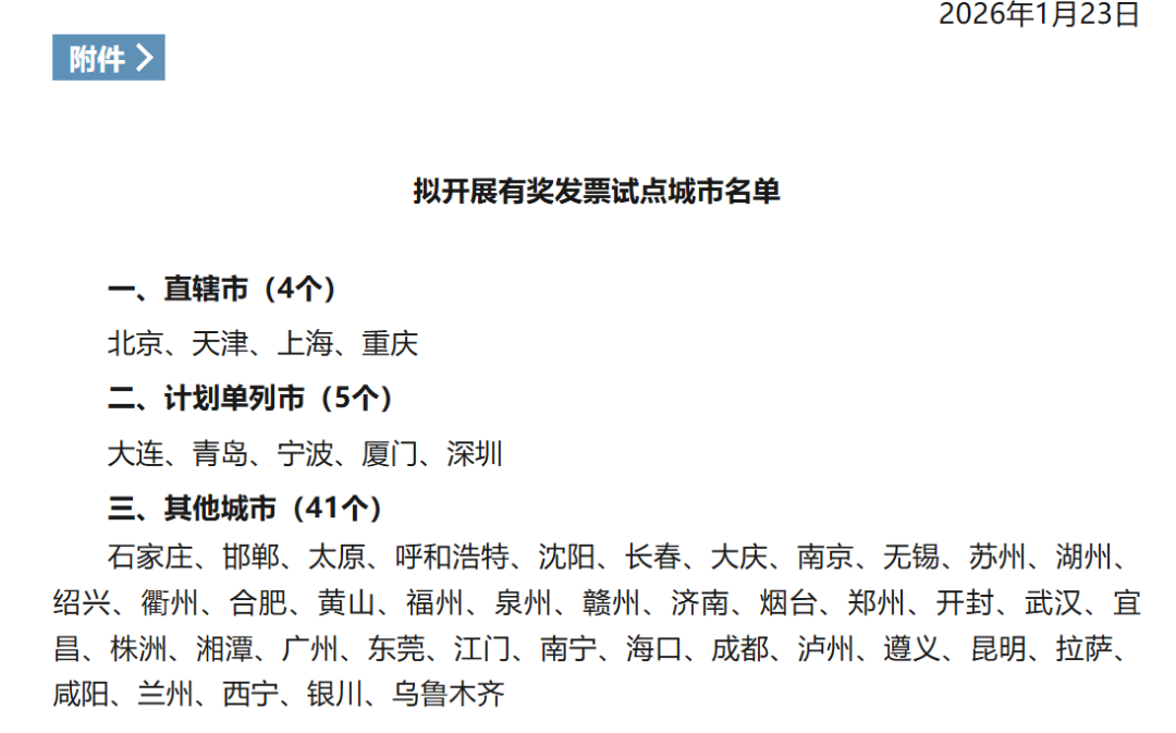 据央视新闻报道,商务部、财政部、国家税务总局1月23日对外公示拟开展有奖发票试点城市名单,包括北京、上海等50个城市入选。 具体涉及零售、餐饮、住宿、文化艺术、娱乐、旅游、体育、居民服务业等领域,覆盖日常消费主要场景。只要在试点城市开具了符合条件的 发票,每个人都有参与机会,都有中奖机会。试点城市自行确定中奖发票最低票面额度(不低于100元)、中奖比例和奖项设置,单张发票奖 项金额原则上不超过800元,政策实施期为6个月。 出品丨21财经客户端 21世纪经济报道 视频|柳润瑛 编辑|黎雨桐 见习编辑林芊蔚 机票锁座将被规范 6500亿光模块龙头,登顶公募基金第一重仓股 证监会亮剑:长药锁定退市、立方遭警示,火中取栗式炒作遭棒喝 SFC 21君荐读 图/ 国家税务总局公众号 ...