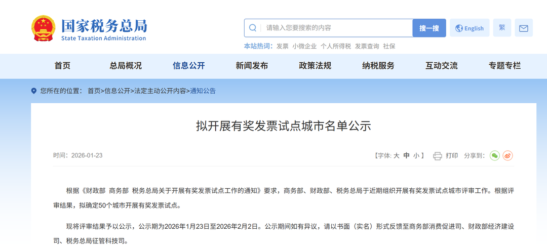 (来源:东北新闻网) 国家税务总局网站截图。 根据《财政部 商务部 税务总局关于开展有奖发票试点工作的通知》要求,商务部、财政部、税务总局于近期组织开展有奖发票试点城市评审工作。根据 评审结果,拟确定50个城市开展有奖发票试点。 现将评审结果予以公示,公示期为2026年1月23日至2026年2月2日。公示期间如有异议,请以书面(实名)形式反馈至商务部消费促进司、财政部经济建 设司、税务总局征管科技司。 联系方式: 商务部消费促进司 010-85093057 财政部经济建设司 010-68554524 税务总局征管科技司 010-61989832 商务部消费促进司财政部经济建设司税务总局征管科技司 2026年1月23日 附件 拟开展有奖发票试点城市名单 一、直辖市(4个) 北京、天津、上海、重庆 二、计划单列市(5个) 大连、青岛、宁波、厦门、深圳 三、其他城市(41个) 石家庄、邯郸、太原、呼和浩特、沈阳、长春、大庆、南京、无锡、苏州、湖州、绍兴、衢州、合肥、黄山、福州、泉州、赣州、济南、烟台、郑州、开 封、武汉、宜昌、株洲、湘潭、广州、东莞、江门、南宁、海口、成都、泸州、遵义、昆明、拉萨、咸阳、兰州、西宁、 ...