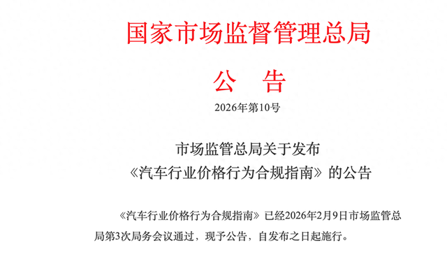 中经记者 尹丽梅 张硕 北京报道 2026年2月12日,国家市场监督管理总局发布2026年第10号公告,《汽车行业价格行为合规指南》(以 下简称"《指南》")经2026年2月9日市场监管总局第3次局务会议通过,自发布之日起正式施行。 《指南》还规定,汽车整车生产企业之间以及汽车零部件生产企业之间,实施下列价格串通行为存在重 大法律风险:固定或者变更整车及零部件价格水平;固定或者变更价格变动幅度;约定采用统一的价格 计算标准;其他价格串通行为。 《指南》称,汽车生产企业除了依法降价处理积压商品外,以排挤竞争对手或者独占市场为目的实施下 列价格行为,存在重大法律风险:整车及零部件的出厂价格低于其生产成本;采用高规格、高等级充当 低规格、低等级等手段变相降低价格,使实际出厂价格低于其生产成本;通过采取折扣、补贴等价格优 惠手段,使实际出厂价格低于其生产成本;进行非对等物资串换,使实际出厂价格低于其生产成本;通 过以物抵债,使实际出厂价格低于其生产成本;采取多发货少开票或不开票等方法,使实际出厂价格低 于其生产成本;通过多给数量、批量优惠等方式,变相降低价格,使实际出厂价格低于其生产成本;在 招标投标中,采用压低标价 ...