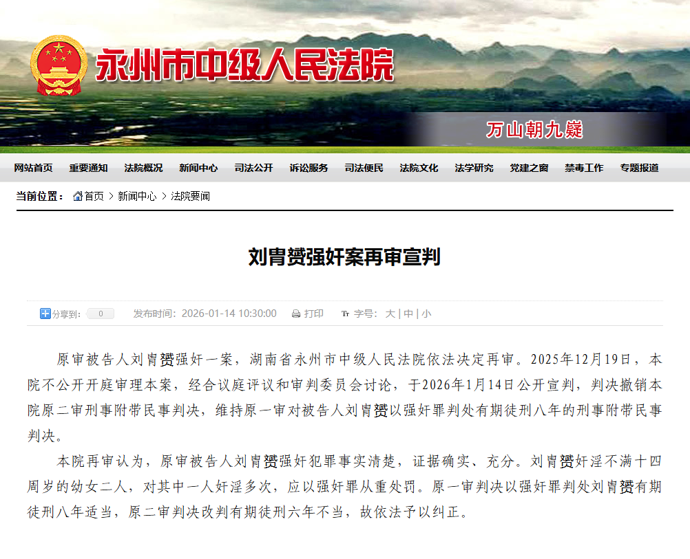 央视网消息:据湖南省永州市中级人民法院消息,原审被告人刘胄赟强奸一案,湖南省永州市中级人民法院依法决定再审。2025年12月19日, 本院不公开开庭审理本案,经合议庭评议和审判委员会讨论,于2026年1月14日公开宣判,判决撤销本院原二审刑事附带民事判决,维持原一 审对被告人刘胄赟以强奸罪判处有期徒刑八年的刑事附带民事判决。 本院再审认为,原审被告人刘胄赟强奸犯罪事实清楚,证据确实、充分。刘胄赟奸淫不满十四周岁的幼女二人,对其中一人奸淫多次,应以强 奸罪从重处罚。原一审判决以强奸罪判处刘胄赟有期徒刑八年适当,原二审判决改判有期徒刑六年不当,故依法予以纠正。 ...