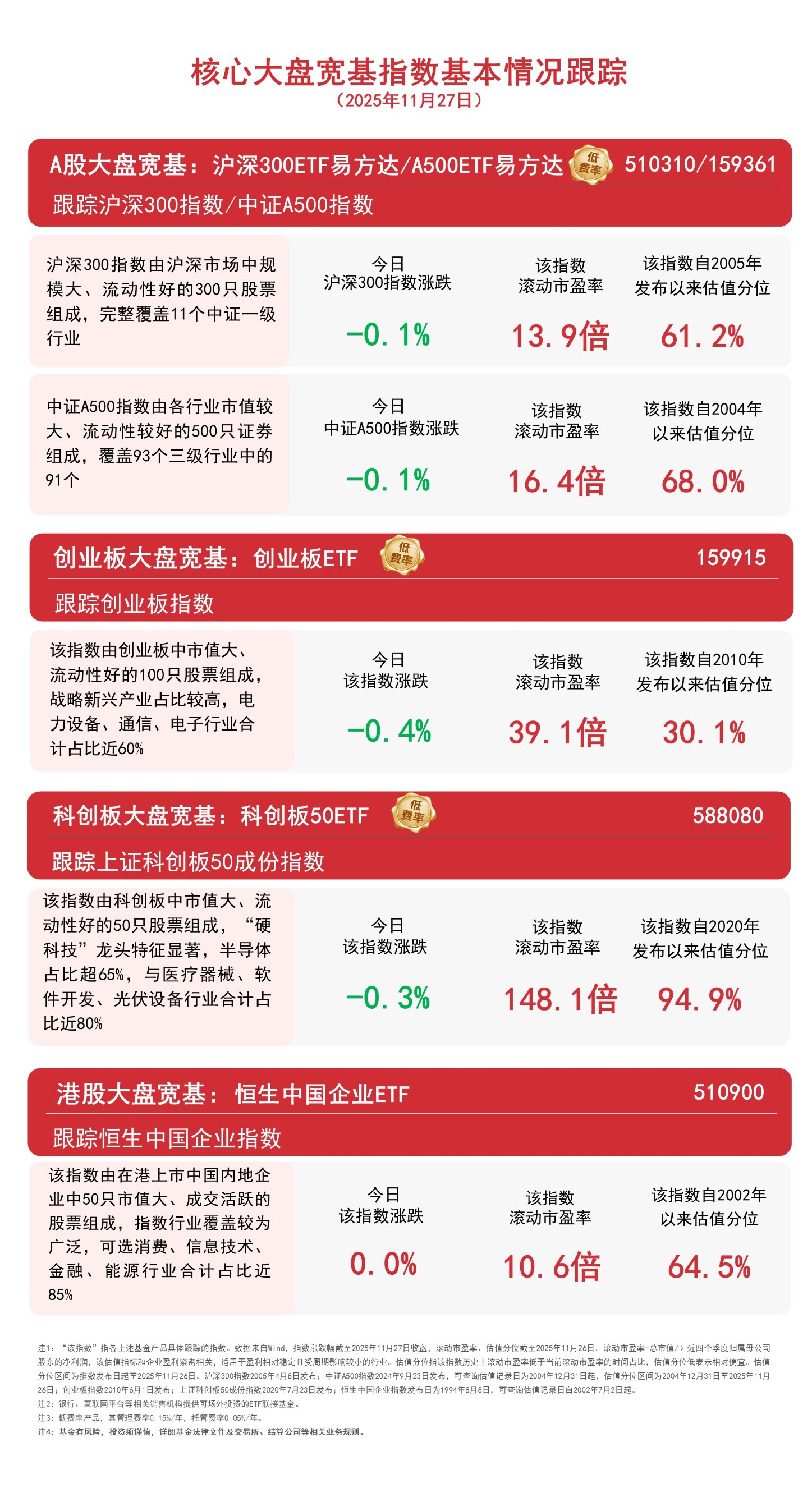 今日市场冲高回落,三大指数涨跌不一,全市场超2700只个股上涨。板块方面,有机硅、电池、消费电子等板块涨幅居前,海南、影视院线、AID用等板 块跌幅居前;港股全天震荡,创新药板块延续涨势,科技股走势分化。截至收盘,中证A500指数、沪深300指数均下跌0.1%,创业板指数下跌0.9%,上证科 创板50成份指数下跌0.3%,恒生中国企业指数上涨0.03%。 核心大盘宽基指数基本情况跟踪 (2025年11月27日) A股大盘宽基:沪深300ETF易方达/A500ETF易方达 跟踪沪深300指数/中证A500指数 沪深300指数由沪深市场中规 模大、流动性好的300只股票 组成,完整覆盖11个中证一级 行业 令日 沪深300指数涨跌 创业板大盘宽基:创业板ETF 跟踪创业板指数 该指数由创业板中市值大、 流动性好的100只股票组成, 战略新兴产业占比较高,电 力设备、通信、电子行业合 计占比近60% 交日 该指数涨跌 该指数 滚动市盈率 13.9倍 中证A500指数由各行业市值较 大、流动性较好的500只证券 组成,覆盖93个三级行业中的 91个 令日 中证A500指数涨跌 -0. 1% 该指数 滚动市盈率 16. ...