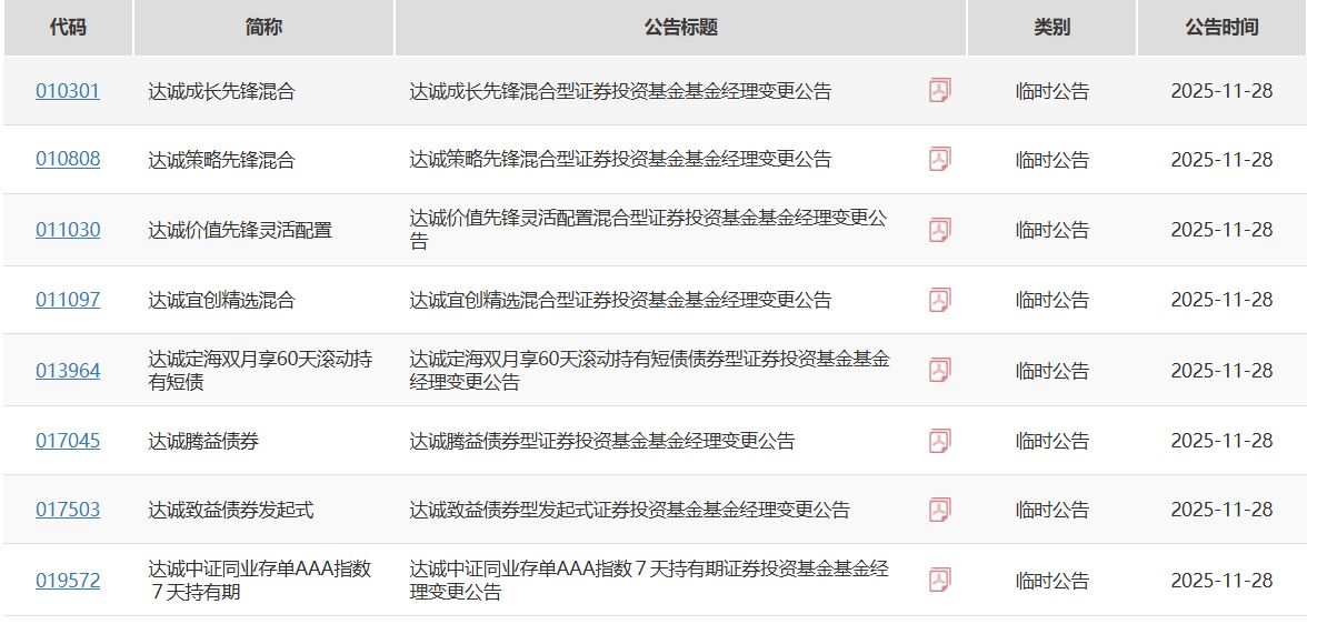 今日,达诚基金同时公告8只基金变更基金经理。《每日经济新闻》记者注意到,这8只产品主要涉及两位基金经理陈佶和吴昊阳。其中,陈佶主要管理固收 类产品,吴昊阳主要管理权益类产品。 对于大型公募而言,同一天离任两位基金经理已是不多见,而对于达诚基金来说,公司仅有4位基金经理。随着上述两位离任,该公司基金经理人数只剩下 两人。 回顾过往,达诚基金多位基金经理曾出现任期未满3年就跳槽的情况。此外,公司自成立以来,管理规模增长缓慢,今年以来还未有新基金发行成立。 | 4488 | 简称 | 公告标题 | | 类别 | 公告 | | --- | --- | --- | --- | --- | --- | | 010301 | 达诚成长先锋混合 | 达诚成长先锋混合型证券投资其金基金经理变更公告 | 国 | 临时公告 | 2025- | | 010808 | 大诚策略先锋混合 | 达诚策略先锋混合型证券投资基金基金经理变更公告 | 国 | 临时公告 | 2025- | | 011030 | 达诚价值先锋灵活配置 | 达成价值先锋会清晰精湛合型加券投资基金基金经理变更公 告 | 国 | 临时公告 | 2025- | | 011 ...