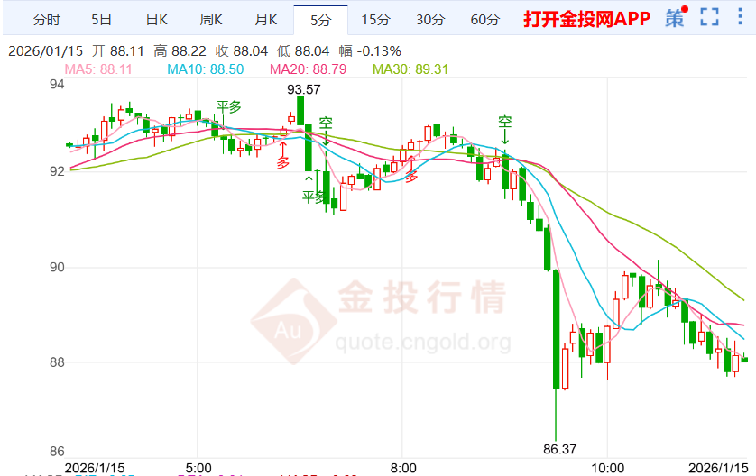 此轮涨势的催化剂包括美股基准指数下跌、美国对伊朗采取军事行动预期引发的额外避险需求,以及最高法院推迟对 关税的裁决(这改善了美国的财政前景)。 供应方面的考量也发挥了作用。此前两天进行的国债拍卖需求强劲,同时纽约时间周三下午2点进行的例行国债回购操 作目标为20至30年到期的债券。此外,美债还受到英债上涨的支撑,10年期英债收益率跌至4.35%,创一年多以来收盘 新低。 【最新国际白银行情解析】 今日周四(1月15日)亚盘时段,国际白银目前交投于88.88一线下方,今日开盘于93.57美元/盎司,截至发稿,国际白银 暂报88.21美元/盎司,下跌5.33%,最高触及93.57美元/盎司,最低下探86.37美元/盎司,目前来看,国际白银盘内短线 偏向震荡走势。 【要闻速递】 随着避险需求升温及债券供应因素影响,美债价格上涨,推动30年期国债收益率跌至今年以来最低水平。美国债市吸 引力下降,促使资金转向贵金属等替代资产。鉴于白银兼具临时避险属性,国债收益率下行导致固定收益资产回报降 低,这在短期内有望持续支撑白银需求,进而使白银的买盘压力维持在较高水平。 纽约时间中午前不久,各期限国债收益率普遍走低至少2个基点, ...
