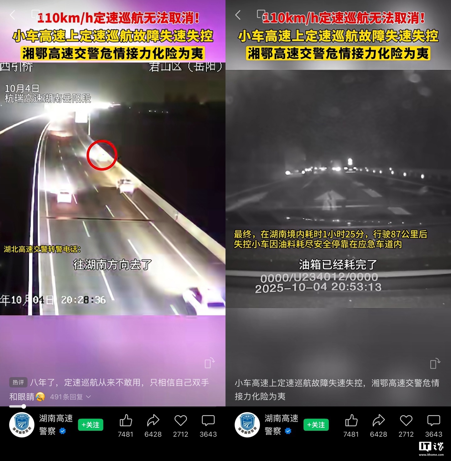 秒 新浪财经APP Sina Finance Mobile Version 24小时全球 下载APP > re 根据车辆驾驶员曾某描述,他是在钟祥市罗集镇驾车上的 S53 枣石高速,准备前往沙洋县,定速巡航时速 110 公里,在离沙洋收费站出口 5 公里处发现定 速巡航失灵,不能减速,只能继续沿 S53 往前行驶,他对警方一路的帮助表示由衷的感谢。 随后大队迅速将警情通报给湖南华容高速交警,同时利用有限的时间,把前方的路况信息以及如何解决定速巡航失灵和降速的方法告知驾驶员,让其提前作 出应对。终于,该车在到达互通前,车速降到时速 100 公里,有惊无险地通过互通。随后,高警江南大队的警车在失控车辆进入湖南华容后很快追上该车, 鸣笛亮灯尾随保护。 失控车辆进入湖南境内后,湖南华容高警接力电话引导,高警江南大队跟随的警车随时向华容高警通报失控车辆位置。慢慢地,失控车辆车速降到了时速 70 公里。最终,失控车辆湖南境内耗时 1 小时 25 分,行驶 87 公里后,因汽油耗尽,在 G56 杭瑞高速君山段停下,人车平安。 IT之家 10 月 12 日消息,据"湖南高速交警"公众号,2025 国庆中秋假期 10 月 4 ...
