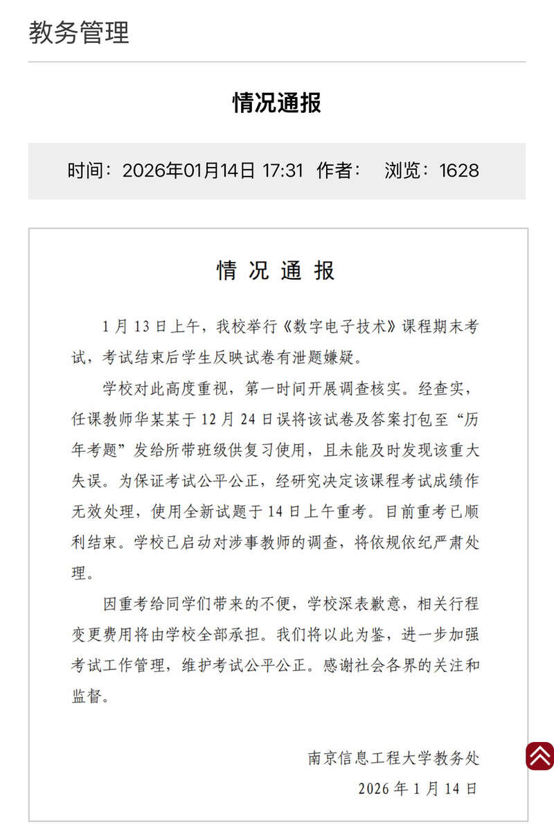 中国青年报客户端讯(中青报·中青网记者 谭思静 实习生 吕其潼)1月14日,南京信息工程大学教务处发布情况通 报称,该校《数字电子技术》课程期末考试因任课教师误发试卷及答案导致泄题嫌疑,原考试成绩作无效处理, 学校已于1月14日上午组织学生使用全新试题重考,且重考已顺利结束。 南京信息工业大学教育处发布情况通报。 通报显示,1月13日上午该校举行《数字电子技术》课程期末考试,考试结束后有学生反映试卷存在泄题嫌疑。学 校随即开展调查核实,确认任课教师华某某于12月24日误将该试卷及答案打包至"历年考题"中发给所带班级供复 习使用,且未及时发现这一失误。 为保障考试公平公正,学校研究决定作废该课程原考试成绩,并启用全新试题安排重考。同时,学校已启动对涉 事教师华某某的调查,将依规依纪对其作出严肃处理。 一名参与重考的学生告诉记者:"有个老师考前把试卷和补考卷全部当作复习资料发给他的学生了。"该名学生表 示,《数字电子技术》是1月13日上午考的,当天下午考试结束后,学校要求学生不能离开学校,要返校第二天 (1月14日)早上重新考试。 截至发稿前,记者尝试联系南京工程信息大学,对方未接电话。 责任编辑:邱晨辉 梁国胜 ...
