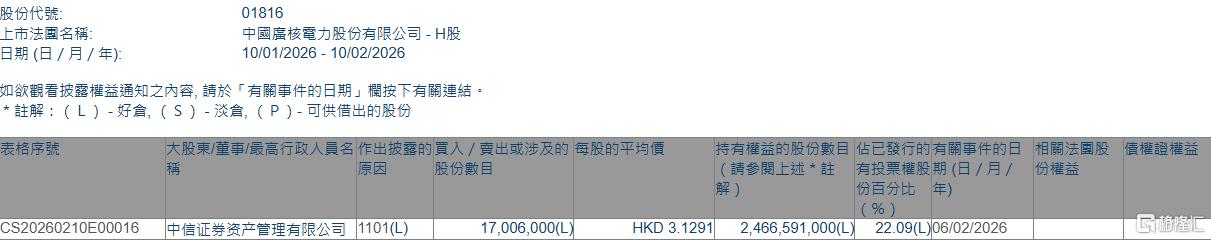 增持后,中信证券资产管理有限公司最新持股数目为2,466,591,000股,持股比例由21.94%上升至22.09%。 格隆汇2月10日丨根据联交所最新权益披露资料显示,2026年2月6日,中广核电力(01816.HK)获中信证券资产管理有限公司在场内以每股均价3.1291港元增 持1700.6万股,涉资约5321.35万港元。 | 股份代號: | 01816 | | --- | --- | | 上市法國名稱: | 中國廣核電力股份有限公司 - H股 | | 日期 (日 / 月 / 年): | 10/01/2026 - 10/02/2026 | | 表格序號 | 大股東/董事/最高行政人員名 作出披露的買入 / 賣出或涉及的 每股的平均價 | | | 持有權益的股份數目 佔已發行的有關事件的日 相關法團 | | --- | --- | --- | --- | --- | | | 股份數目 | | | (請參閱上述 * 註 有投票權股期(日/月/ 份權益 | | | | | | 份自分比 年 | | And and the control of the control of the property of th ...