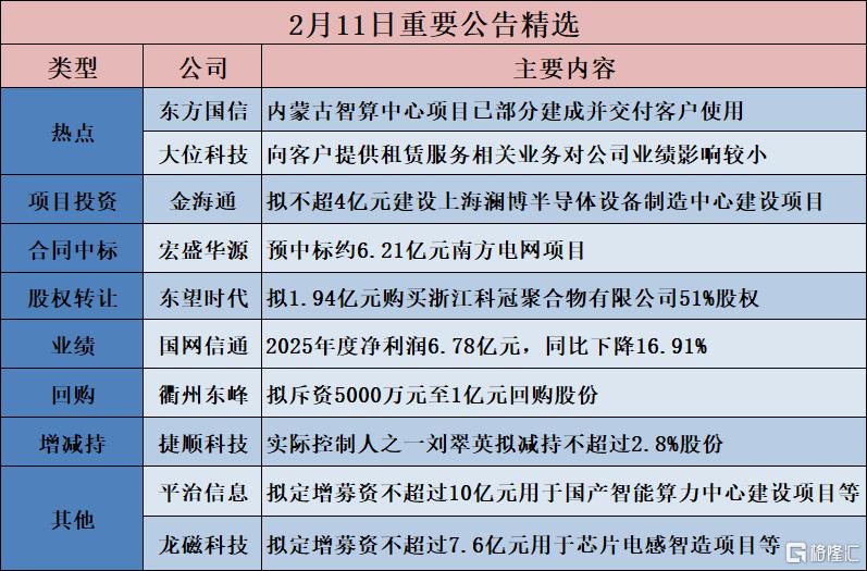 | | | 2月11日重要公告精选 | | --- | --- | --- | | 类型 | 公司 | 主要内容 | | 热点 | 东方国信 | 内蒙古智算中心项目已部分建成并交付客户使用 | | | 大位科技 | 向客户提供租赁服务相关业务对公司业绩影响较小 | | 项目投资 | 金海道 | 拟不超4亿元建设上海澜博半导体设备制造中心建设项目 | | 合同中标 | 宏盛华源 | 预中标约6.21亿元南方电网项目 | | 股权转让 | 东望时代 | 拟1.94亿元购买浙江科冠聚合物有限公司51%股权 | | 业绩 | 国网信通 | 2025年度净利润6.78亿元,同比下降16.91% | | 回购 | 衢州东峰 | 拟斥资5000万元至1亿元回购股份 | | 增减持 | 捷顺科技 | 实际控制人之一刘翠英拟减持不超过2.8%股份 | | 其他 | 平治信息 | 拟定增募资不超过10亿元用于国产智能算力中心建设项目等 | | | 龙磁科技 | 拟定增募资不超过7.6亿元用于芯片电感智造项目等 □ BIZE | 【热点】 金海通(603061.SH):拟出资不超过4亿元建设上海澜博半导体设备制造中心建设项目 【中 ...