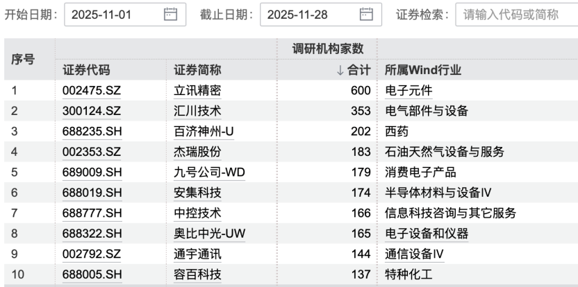 Core Insights - The overall institutional research activity remains high, with nearly 300 listed companies disclosing investor research records in the past week [1] - Foreign institutions, particularly Point72 Asset Management, have been actively researching A-share companies, indicating strong interest in the market [1][8] - Despite recent adjustments in the technology sector, hard technology fields like electronic components and integrated circuits continue to attract significant institutional research [1][17] Institutional Research Activity - In November, nearly 1,500 companies were researched by institutions, with Luxshare Precision being the most popular, attracting 600 research institutions [3][5] - The top ten companies by the number of research institutions in November include: - Luxshare Precision: 600 - Huichuan Technology: 353 - BeiGene: 202 - Jerry Holdings: 183 - Ninebot: 179 - Anji Technology: 174 - Zhongkong Technology: 166 - Orbbec: 165 - Tongyu Communication: 144 - Rongbai Technology: 137 [5] Recent Research Trends - In the past week, Jerry Holdings had the highest number of research institutions, reaching 168 [7] - The top ten companies by research institution count in the past week include: - Jerry Holdings: 168 - Fule New Materials: 106 - Century Huatong: 96 - Nacono: 91 - Kaiying Network: 87 - Slin Technology: 50 - Weili Transmission: 46 - Caise Information: 44 - LiuGong: 43 - Orbbec: 42 [7] Foreign Institutional Interest - Point72 Asset Management has been particularly active, conducting 15 research sessions, focusing on stocks like NuoPin, Longtu, and Ninebot [10] - Other foreign institutions such as IGWT Investment and Neuberger Berman have also shown interest in various A-share companies [10] Fund Company Research Activity - Fund companies have maintained high research activity, with Bosera Fund and Huaxia Fund conducting over 90 research sessions each in November [11] - The top ten fund companies by research activity include: - Bosera Fund: 98 sessions - Huaxia Fund: 95 sessions - Guotai Fund: 89 sessions - Southern Fund: 77 sessions - CMB Fund: 75 sessions [12] Sector Focus - The technology sector, particularly electronic components and integrated circuits, is viewed as a long-term mainstay in the A-share market despite recent market style shifts from growth to value [1][17] - Analysts suggest focusing on sectors like AI, innovative drugs, energy storage, and solid-state batteries, which are entering a favorable cycle [17]