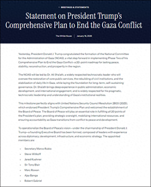 美国白宫网站消息,当地时间1月16日,特朗普政府公布美方主导的巴勒斯坦加沙地带"和平委员会"成 员名单,由美国总统特朗普担任主席,美国务卿鲁比奥、总统特使威特科夫、特朗普的女婿库什纳以及 英国前首相布莱尔均在其列。 美国公布加沙"和平委员会"成员名单白宫网站 值得一提的是,名单中还出现了马克・罗文,现任大型私募股权公司阿波罗全球管理公司的首席执行 官。据以色列《耶路撒冷邮报》此前报道,罗文的祖父是著名的犹太经济学教授。2024年美国总统大选 后,罗文曾被考虑任命为美国财政部长,但最终未获任命。罗文曾积极参与特朗普政府的高等教育政策 制定工作。 特朗普在声明中称,此举兑现了他此前提出的"20点计划"中的部分内容。白宫方面则表示,委员会成 员"将分别负责对加沙稳定与长期成功至关重要的具体事务领域,包括但不限于治理能力建设、地区关 系、重建工作、投资吸引、大规模融资以及资本动员"。 马克·罗文纽约时报 另据英国《金融时报》报道,新成立的委员会成员中不包括任何巴勒斯坦人或阿拉伯国家领导人。然 而,在去年10月于埃及举行的加沙"和平"峰会上,特朗普曾表示,一些与会领导人有意加入"和平委员 会"。因此《金融时报》预计,未 ...
