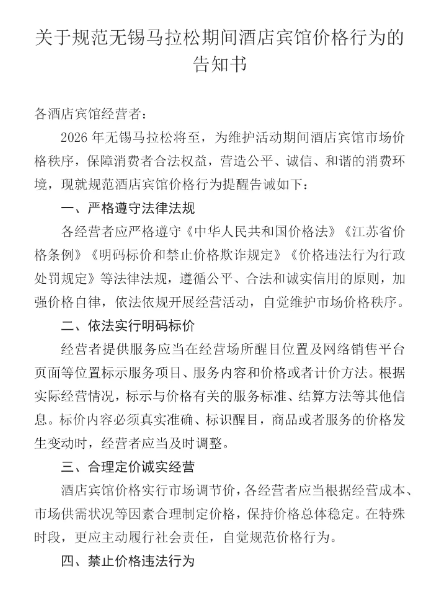 公告要求经营者提供服务应当在经营场所醒目位置及网络销售平台页面等位置标示服务项目、服务内容 和价格或者计价方法。根据实际经营情况,标示与价格有关的服务标准、结算方法等其他信息。标价内 容必须真实准确、标识醒目,商品或者服务的价格发生变动时,经营者应当及时调整。酒店宾馆价格实 行市场调节价,各经营者应当根据经营成本、市场供需状况等因素合理制定价格,保持价格总体稳定。 在特殊时段,更应主动履行社会责任,自觉规范价格行为。 公告要求不得捏造、散布涨价信息,哄抬价格,扰乱市场价格秩序;不得以低价诱骗消费者或者其他经 营者,以高价进行结算;不得通过虚假折价、减价或者价格比较等方式销售商品或者提供服务;不得无 正当理由拒绝履行或者不完全履行价格承诺;不得在标价之外加价提供服务或销售商品,收取未标明的 费用。同时,通过网络等方式销售商品或者提供服务的,应当通过网络页面,以文字、图像等方式进行 明码标价。网络交易平台经营者不得利用技术手段等强制平台内经营者进行虚假的或者使人误解的价格 标示。 公告称,无锡各级部门将加大对酒店宾馆行业价格行为的巡查检查力度和频次,对经提醒告诫仍不整 改,实施价格违法违规行为的,将依法从严查处, ...