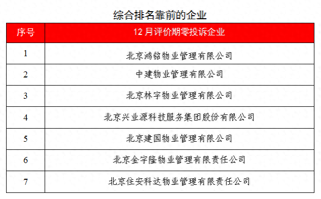 "小物业"牵动"大民生" 打造和谐、美好的社区 离不开优质的物业服务 朝阳区2025年12月 物业服务"红黑榜"来了 快来看看有没有你家小区 (12月榜单见文末) 关键词:红黑榜 为持续落实《北京市物业管理条例》,进一步加强对全区物业服务企业的监督管理,压实物业服务企业 在办理市民热线投诉工作中的责任,切实发挥接诉即办民生大数据作用,根据我区物业管理类诉求办理 情况,建立物业服务企业市民诉求办理情况排名。通过公布排名情况,引导物业服务企业做好市民诉求 办理工作,切实提升物业服务水平。 关键词:评选方法 每期公布综合排名靠前的企业(包括:零诉求企业以及综合排名较好企业)以及综合排名靠后的项目。 由朝阳区城市管理指挥中心发布,榜单将在"北京朝阳"和朝阳区物业管理网站以及其他媒体平台予以公 示。 十二月考核结果 12月评价期,共受理物业管理类投诉7503件,其中诉求量前五的问题分别为:物业服务不规范3718件, 占比49.6%;小区停车秩序管理1411件,占比18.8%;业主大会及业委会1065件,占比14.2%;小区安保 问题749件,占比10.0%;物业收费问题502件,占比6.7%。 12月物业公司红榜 | ...