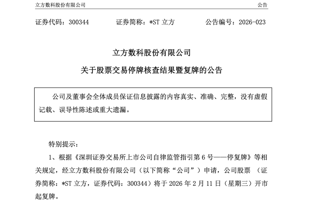 2月10日,*ST立方发布公告称,停牌期间,公司就股价波动的相关事项进行了核查。鉴于相关自查工作已完成,经申请,公司股票将于2月11日(星期 三)开市起复牌。 *ST立方提示称,目前,公司股票价格已严重脱离公司基本面情况,存在市场情绪过热、非理性炒作的风险。未来可能存在股价快速下跌的风险。 股价波动核查工作已完成 *ST立方明日复牌 2月10日,*ST立方发布公告称,停牌期间,公司就股价波动的相关事项进行了核查。鉴于相关自查工作已完成,根据相关规定,经公司申请,公司股票 将于2月11日(星期三)开市起复牌。 公司股票自2026年1月20日至2026年2月5日的10个交易日(去除停牌的3个交易日)中有7个交易日涨停,价格涨幅为314.93%,其间多次触及股票交易异 常波动情形,公司股票短期内价格涨幅较大,明显偏离市场走势,未来可能存在股价快速下跌的风险。 *ST立方表示,如未来公司股票价格进一步异常上涨,公司可能再次向深圳证券交易所申请停牌核查。敬请广大投资者务必充分了解二级市场交易风险, 理性决策,审慎投资。 2月10日,深交所发布关于*ST立方股票交易的风险提示。近期,*ST立方股价大幅波动,已多次触发股价 ...