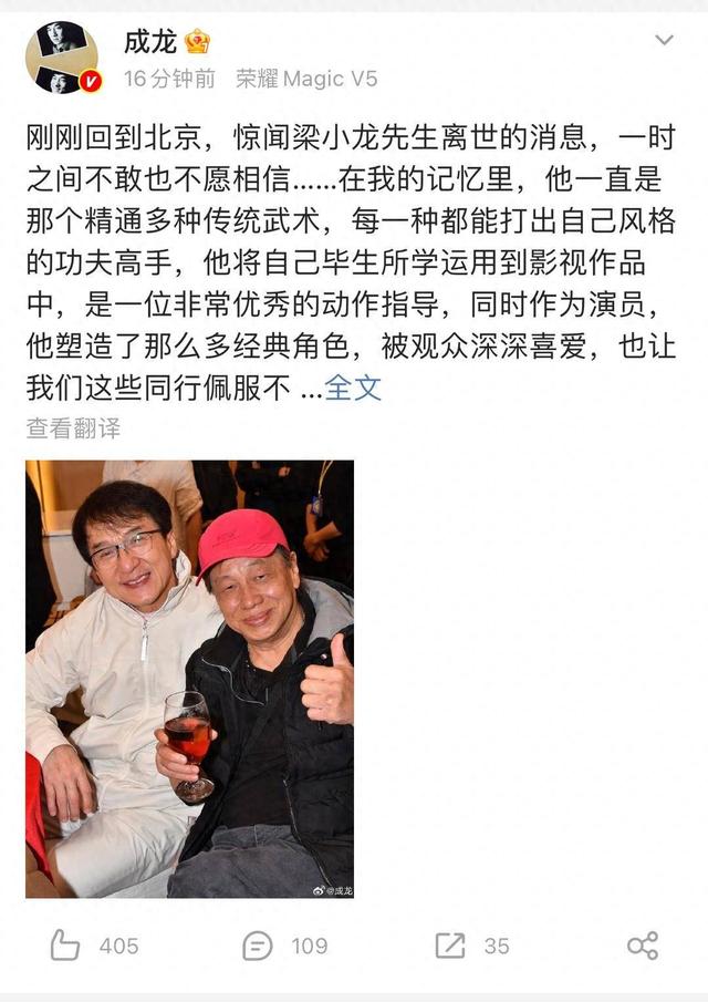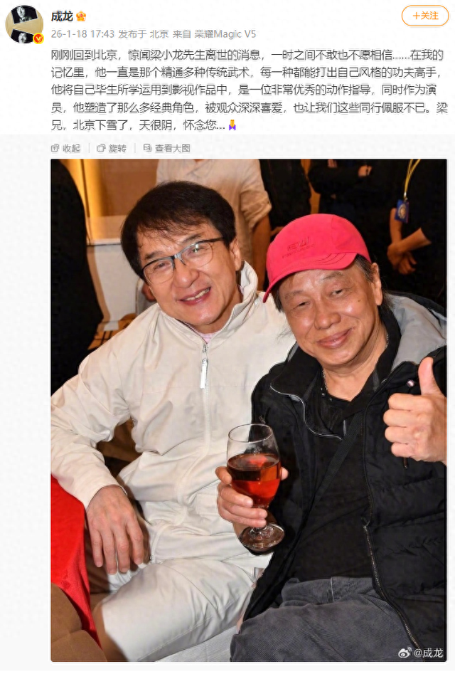 #周星驰三次邀请梁小龙演火云邪神#【#成龙说梁小龙将毕生所学用于作品#】1月14日,#梁小龙去世 #,享年77岁。 @成龙 发文悼念:"惊闻梁小龙先生离世的消息,一时之间不敢也不愿相信……在我的 记忆里,他一直是那个精通多种传统武术,每一种都能打出自己风格的功夫高手,他将自己毕生所学运 用到影视作品中,是一位非常优秀的动作指导,同时作为演员,他塑造了那么多经典角色,被观众深深 喜爱,也让我们这些同行佩服不已。梁兄,北京下雪了,天很阴,怀念您…"(记者 孔小平 剪辑 庆苗 苗) ...