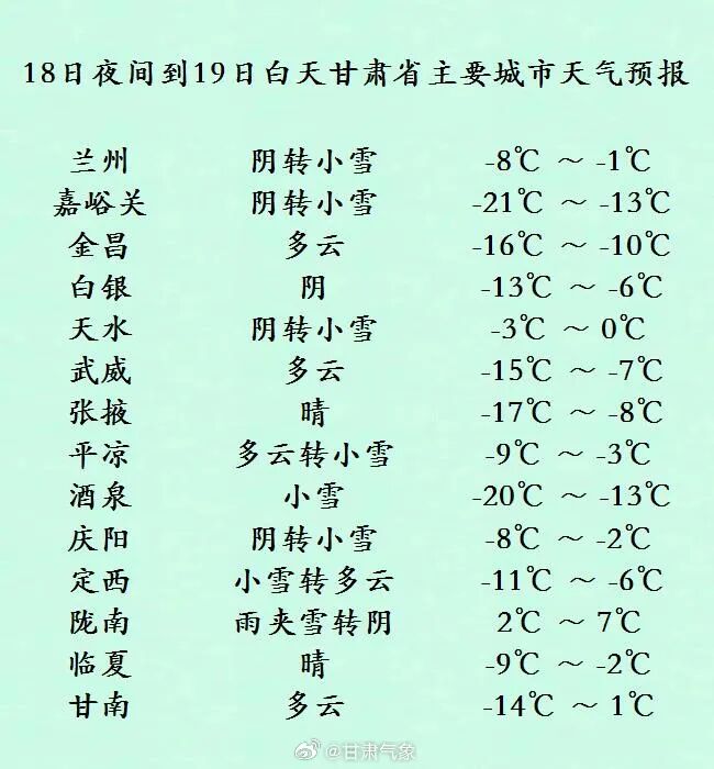 今天夜间到明天白天(1月18日20时-1月19日20时),定西、陇南、天水、平凉、庆阳等市阴有小雪或 雨夹雪,其中平凉、庆阳两市局部地方有中雪,陇南市东南部有冻雨;兰州、白银、临夏三市州阴间多 云,部分地方有小雪或阵雪;省内其余地方多云间阴,局部地方有阵雪或小雪。 | 兰州 | 阴转小雪 | -8℃ ~- -1℃ | | --- | --- | --- | | 嘉峪关 | 阴转小雪 | -21℃ ~ -13℃ | | 金昌 | 多云 | -16℃ ~ -10℃ | | 白银 | 明 | -13℃ ~ -6℃ | | 天水 | 阴转小雪 | -3℃ ~ 0℃ | | 武威 | 多云 | -15℃ ~ -7℃ | | 张掖 | 晴 | -17℃ ~ -8℃ | | 平凉 | 多云转小雪 | -9℃ ~ - 3℃ | | 酒泉 | 小雪 | -20℃ ~ -13℃ | | 庆阳 | 朋转小雪 | -8℃ ~ -2℃ | | 定西 | 小雪转多云 | -11°C ~ -6°C | | 陇南 | 雨夹雪转阴 | 2℃ ~ 7℃ | | 临夏 | 晴 | -9℃ ~ -2℃ | | 甘南 | 多云 | -14℃ ~ 1℃ ...