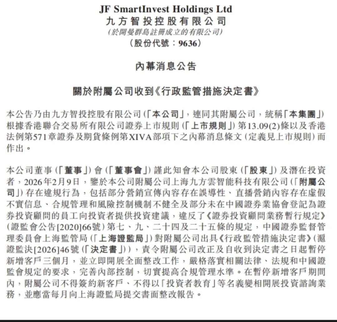 2月9日晚间,港股上市机构九方智投控股有限公司(以下简称"九方智投控股")公告显示,上海证监局对子公司上海九方云智能科技有限公司(以下简称"九 方智投")出具《行政监管措施决定书》,责令该公司改正及自收到决定书之日起暂停新增客户三个月,并立即开展全面整改工作。 又一家证券投顾机构被暂停新增客户。 九方智投控股在公告中表示,公司高度重视决定书所指出的问题,针对有关问题已制定整改方案并立即全面推动落实,将以此次整改为契机完善内部控 制,切实提高合规管理水平。 公告显示,其整改方案包括:严肃处理涉及违规的个别人员,并组织开展专项合规教育培训,增加检查频率;进一步加强规范营销宣传行为,通过技术监 测与人工覆核,以保障营销宣传内容真实、准确、适度并遏制误导性宣传;强化直播内容管理,聚焦内容真实、数据准确、逻辑严谨,进一步加强素材溯 源、事前审查、事中监测与事后审查的管理系统,确保信息可溯可查;健全合规风控体系,优化营销、直播及人员资质管理等合规风控系统;明确业务操 作边界,严禁未经合规审查观点传播与不当解读,防范未登记备案人员违规提供投资建议。 九方智投控股称,公司经营状况正常,本次监督管理措施系对附属公司部分业务环节 ...