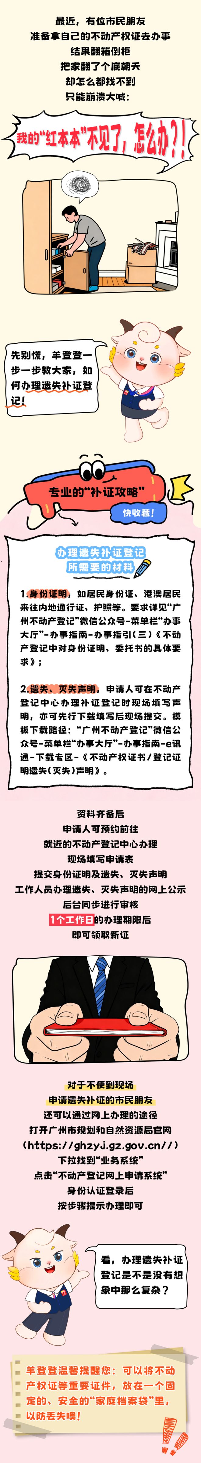 对于不便到现场 申请遗失补证的市民朋友 还可以通过网上办理的途径 打开广州市规划和自然资源局官网 (https://ghzyj.gz.gov.cn/ / ) 下拉找到"业务系统" 点击"不动产登记网上申请系统" 身份认证登录后 按步骤提示办理即可 先别慌,羊登登· 步一步教大家,如 何办理遗失补证登 ill 专业的"补证攻略" 快收藏! 办理遗失补证登记 所需要的材料 0 1.身份证明,如居民身份证、港澳居民 来往内地通行证、护照等。要求详见"广 州不动产登记"微信公众号-菜单栏"办事 大厅"-办事指南-办事指引(三)《不动 上 。 厂豆にギハラ初ルツ、女たわけ身神女 求》; 2. 遗失、灭失声明,申请人可在不动产 登记中心办理补证登记时现场填写声 明,亦可先行下载填写后现场提交。模 板下载路径:"广州不动产登记"微信公 众号-菜单栏"办事大厅"-办事指南-e讯 通-下载专区-《不动产权证书/登记证 明遗失(灭失)声明》。 资料齐备后 申请人可预约前往 就近的不动产登记中心办理 现场填写申请表 提交身份证明及遗失、灭失声明 工作人员办理遗失、灭失声明的网上公示 后台同步进行审核 1个工作目的办理期限后 即可领 ...