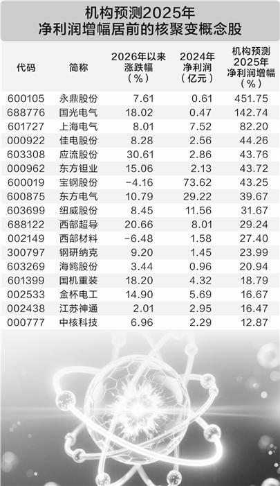 | | | 2026年以来 | 2024年 | 机构预测 2025年 | | --- | --- | --- | --- | --- | | 代码 | 简称 | 涨跌幅 | 净利润 | 净利润增幅 | | | | (%) | (亿元) | | | | | | | (%) | | 600105 | 永鼎股份 | 7.61 | 0.61 | 451.75 | | 688776 | 国光电气 | 18.02 | 0.47 | 142.74 | | 601727 | 上海电气 | 8.01 | 7.52 | 82.20 | | 000922 | 佳电股份 | 8.28 | 2.56 | 44.26 | | 603308 | 应流股份 | 30.61 | 2.86 | 43.76 | | 000962 | 东方铝业 | 15.06 | 2.13 | 43.72 | | 600019 | 宝钢股份 | -4.16 | 73.62 | 43.25 | | 600875 | 东方电气 | 10.79 | 29.22 | 39.67 | | 603699 | 纽威股份 | 8.45 | 11.56 | 31.67 | | 68 ...
