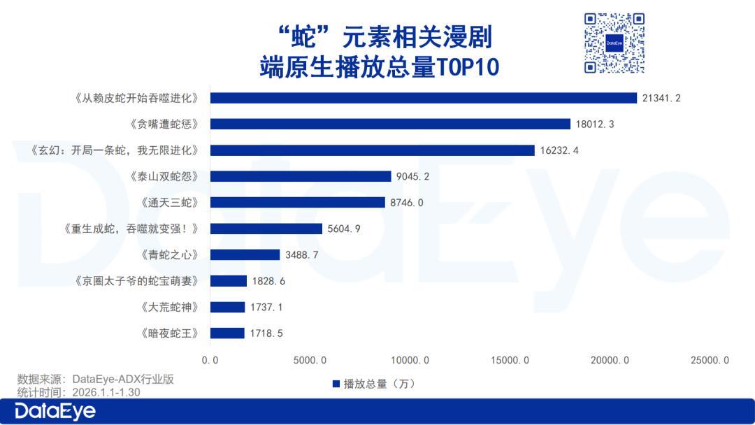 爆款的出现往往伴随着题材风口的爆发。 2026年漫剧赛道的开门红,由一部异军突起的作品提前锁定。 2026年第一个月,漫剧市场就迎来了首部爆款作品——《从赖皮蛇开始吞噬进化》,1月20 日上线,一周内播放总量破2亿,成为当周抖音端原生漫剧播放增量第一的新漫剧,也是今年第一部破2亿的新上线精品漫剧。 DataEye-ADX行业版显示,截至2月1日,该漫剧已经连续在榜12天,连续霸榜红果漫剧榜榜首9天,最高红果热度为5458W。 该漫剧的爆火还直接带动了漫剧"神兽进化"题材内容的爆发。例如1月22日红果漫剧热榜中,一天内就有5部与"蛇"相关的新漫剧闯入TOP30,其中2部闯 入TOP4。 看似偶然的爆款背后,藏着哪些可复制的行业逻辑?广告代理厂商跨界入局,为何能快速跑通漫剧全链路?结合DataEye研究院数据与作品拆解,我们试 图揭开2026漫剧赛道的爆款密码与产业新趋势。 蛇元素爆发:漫剧赛道的新变量,还是短期风口? 题材红利的集中释放,是《赖皮蛇》能够快速破圈的重要前提,但这并非单纯的"跟风偶然",而是赛道需求迭代的必然结果。截至1月28日,"蛇"元素在 播的漫剧共223部,其中今年1月上线的"蛇"元素漫剧达 ...