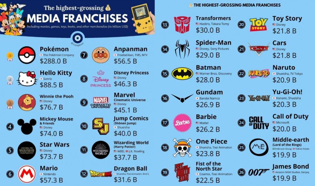 大家最为熟知的迪士尼的招牌米老鼠居然还不敌小熊维尼。小熊维尼767亿美元的收入略高于米老鼠的740亿美元。在维基百科的数据里,米老鼠和小熊维 尼之间的整体收益其实差距并不大,所以Civixplorer采用的什么模式来进行统计就不太了解。不过小熊维尼在母婴和亲子消费市场表现特别突出,而这个 市场本身也非常庞大。 榜单靠后的《星球大战》、马里奥、面包超人等IP的排名均较为合理,而排在第19位的《北斗神拳》可能让许多人感到意外。作为一部经典老作品,它能 连续多年出现在IP收益榜中,主要得益于日本本土市场的贡献,尤其是线下柏青哥、柏青嫂以及街机授权业务。截至2021年,仅《北斗神拳》与世嘉合作 推出的相关机型就已达约315万台,其中柏青嫂设备占比超过80%。 近日,海外数据调查机构Civixplorer公布了"全球最赚钱媒体特许经营权"排行榜,也就是最赚钱的IP,根据榜单显示,精灵宝可梦以总收入2,880亿美元成 为全球最赚钱知识产权(IP),断档式超越第2名Hello Kitty近2,000亿美元。 此次的统计数据截至2025年12月,涵盖游戏、电影、电视、玩具、交换卡、书籍及商品收入。不过这次的名单里面的数量并不 ...