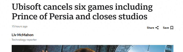 育碧取消《波斯王子》等六款游戏的开发计划,并关闭多个工作室