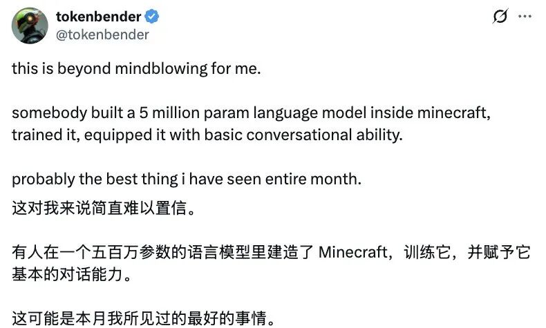 整理 | 屠敏 出品 | CSDN(ID:CSDNnews) 在《我的世界》里搭建一个虚拟的"世界",然后待在里面玩 GPT,这可行吗? 别眨眼,总之已经有人真的这么干了,而且构建起来的排面还颇为惊人! 最近,一位网友在社交媒体 X 上分享了自己的震惊感受:"这对我来说简直震撼到不行。有人居然在 Minecraft 里建了一个 500 万参数的语言模型 , 还训练好了,让它具备基本的对话能力。说实话,这是我这个月看到的 最牛的东西 了。" 虚拟"世界"长这样,左下角显示的 CraftGPT 就是这名牛人创造的 GPT 项目,另外他还搭配了虚拟键盘,方便与这个 GPT 进行对话: 那么,在方块世界里运行 AI 模型 ,他究竟是怎么做到的?我们不妨一起看看! 4.39 亿个方块,在《我的世界》里造了一款 GPT 这名开发者名为 Sammyuri,他花了数月的时间,经过大量的规划和投入,才完成了在 《Minecraft》中运行的小型语言模型 CraftGPT 以及支撑它的 世界。 据 Sammyuri 介绍,起初他只是在 ChatGPT 提了一个问题:"能在 《Minecraft》中构建一个你吗? " 然后就有了后 ...