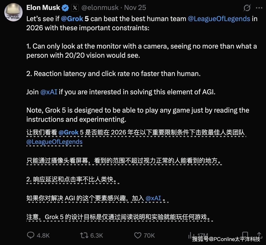 马斯克Grok5挑战人类电竞高手 约战《英雄联盟》顶尖战队