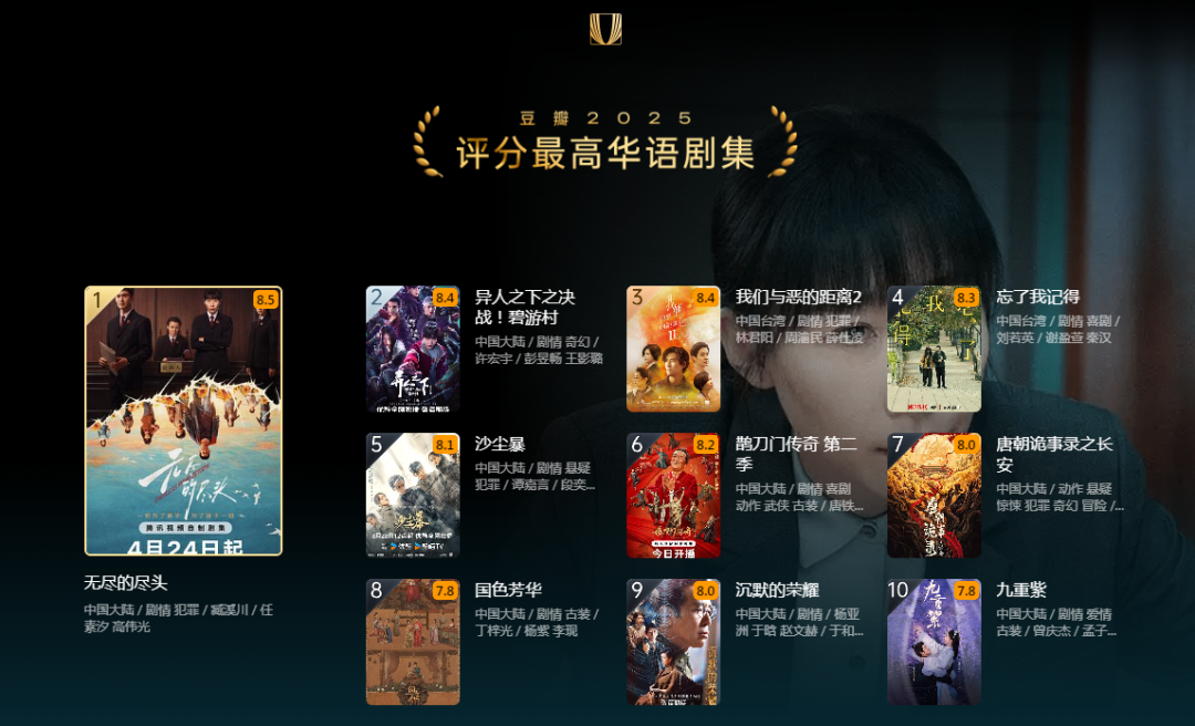 "长剧焦虑"几乎成了这两年行业里的高频词,项目缩减、立项放缓、注意力被分流,但如果把目光真正放回到已经播出的作品上,会发现至少在今年,长 剧并没有如情绪所描述的那样整体失效。 从口碑和市场反馈来看,系列化作品反而成为支撑长剧稳定表现的重要力量。 在刚刚公布的豆瓣2025评分最高华语剧Top10 中,续集等系列化作品占据了一半席位。《唐朝诡事录之长安》超点完结一个月,至今仍稳居云合数据每日 霸屏榜市占率TOP10;东北武侠风情景喜剧《鹊刀门传奇2》延续了前作气质,在类型融合上持续获得高分评价;《异人之下之决战!碧游村》也在播出 过程中不断突破原有二次元圈层壁垒,让更多非核心受众完成"补课式追剧"。这些作品并非偶然走红,而是在观众熟悉的人物、世界观和叙事基础上,完 成了一次又一次向前推进。 某种程度上说,长剧并不是失去了吸引力,而是进入了一个更需要"连续感"的阶段。相比一次性讲完的全新故事,观众更愿意把时间交给已经建立起信任 关系的IP;相比押注单点爆发,平台和影视公司也更希望用可延展的内容结构,来对冲不确定性带来的风险。在这样的现实背景下,系列化不再只是创作 层面的选择,而逐渐成为长剧维持稳定产出的重要方式。 ...