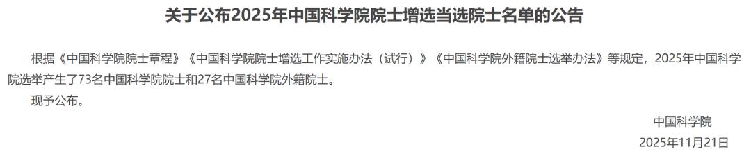 Core Points - The 2025 election results for academicians of the Chinese Academy of Sciences and the Chinese Academy of Engineering have been officially announced, with a total of 144 new academicians elected: 73 from the Chinese Academy of Sciences and 71 from the Chinese Academy of Engineering [1][43]. - Additionally, 27 foreign academicians were added to the Chinese Academy of Sciences and 24 to the Chinese Academy of Engineering [2]. Group 1: New Academicians - Notable election includes Professor Zhou Zhihua from Nanjing University, who specializes in artificial intelligence and machine learning [3][7]. - Zhou Zhihua, born in 1973, has a strong academic background, having obtained his bachelor's, master's, and doctoral degrees from Nanjing University between 1996 and 2000 [5][6]. - He has held various academic positions, including being appointed as a professor in 2003 and later as a doctoral supervisor in 2004 [9][10]. Group 2: Achievements and Contributions - Zhou Zhihua has received significant recognition in the AI field, including being elected as a fellow of several prestigious organizations and serving as the president of the IJCAI council in 2023 [12][18][22]. - His research impact is notable, with over 110,000 citations and an h-index of 133, indicating a high level of influence in his field [23][25]. - His book "Machine Learning" (often referred to as the "Watermelon Book") is widely used as a textbook in over 500 institutions globally [26][27]. Group 3: Total Academicians - Following this election, the total number of academicians in the Chinese Academy of Sciences reaches 908, with 173 foreign academicians, while the Chinese Academy of Engineering now has 1002 academicians, including 148 foreign academicians [57].