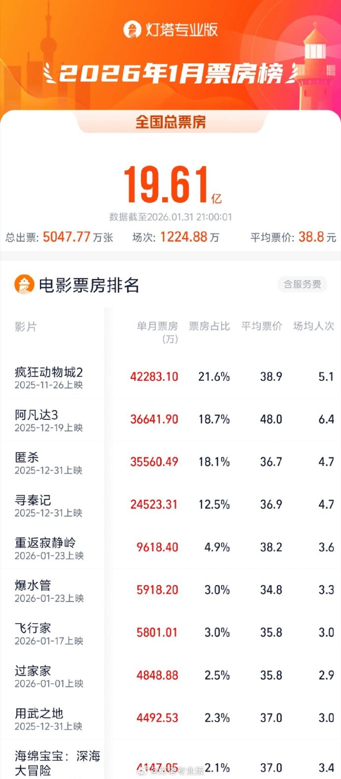 | 寻奏记 | 24523.31 | 12.5% | 36.9 | 4.7 | | --- | --- | --- | --- | --- | | 2025-12-31上映 | | | | | | 重返寂静岭 | 9618.40 | 4.9% | 38.2 | 3.6 | | 2026-01-23上映 | | | | | | 爆水管 2026-01-23上映 | 5918.20 | 3.0% | 34.8 | 3.3 | | 飞行家 | 5801.01 | 3.0% | 35.8 | 3.0 | | 2026-01-17上映 | | | | | | 过家家 | 4848.88 | 2.5% | 35.8 | 2.9 | | 2026-01-01上映 | | | | | | 用武之地 | 4492.53 | 2.3% | 37.0 | 3.0 | | 2025-12-31上映 | | | | | | 海绵宝宝:深海 | A147.05=1152.1% | | 37.0 | 3.4 | | 大冒险 | | | | | 据灯塔专业版,截至1月31日21时,2026年1月总票房19.61亿,《疯狂动物城2》连续3个月 ...
