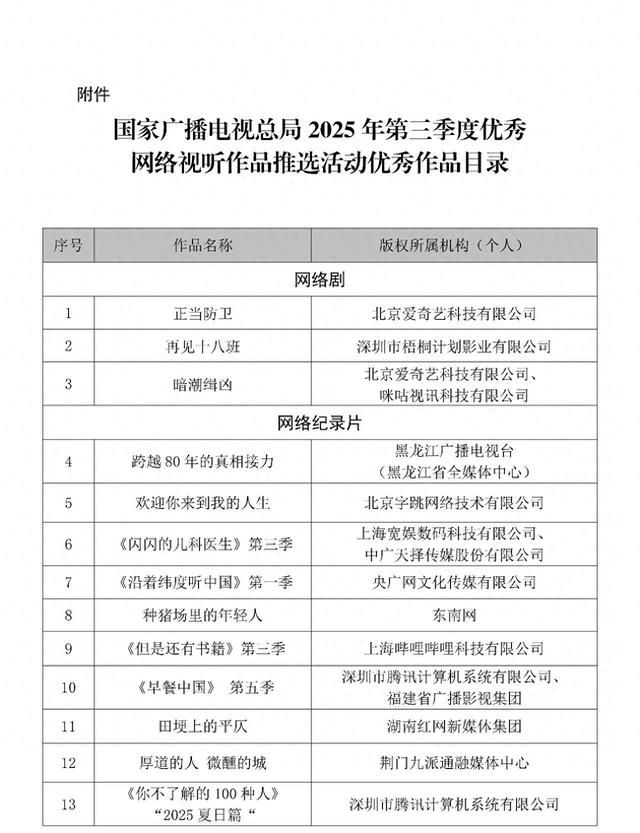 日前,国家广播电视总局公布了2025年第三季度优秀网络视听作品推选活动入选作品名单,其中,由长 影出品的网络微短剧《铁血英魂》亦在此次推优之列。 微短剧《铁血英魂》由吉林省广播电视局策划,与长影时代传媒股份有限公司共同出资制作,共10集, 包括《雪葬》《旗》《最后一颗子弹》《寻父》等故事,于2025年8月15日起在爱奇艺、优酷、腾讯等 平台同步播出。 播电视 高 重点短剧项 E林省 导演:呼馬辰 出品方 吉林省广播电视局 长影时代传媒股份有限公司 泰州东部新城文化产业有限公司 值得一提的是,该剧创作团队秉持"以真动人、以小见大"的创作理念,摒弃宏大叙事,转而聚焦英雄作 为普通人的真实情感与成长轨迹,并通过军旗、口琴、玉米粒等微小物件串联故事,着重表现东北抗联 将士坚定的理想信念和革命英雄主义精神,于细节处构建真实的历史时空,展现烽火岁月中的人性光 辉,引发了观众的情感共鸣。 来源:彩练新闻 作者:马璐 | 序号 | 作品名称 | 版权所属机构(个人) | | --- | --- | --- | | | 网络剧 | | | 1 | 正当防卫 | 北京爱奇艺科技有限公司 | | 2 | 再见十八班 | 深圳市梧桐 ...