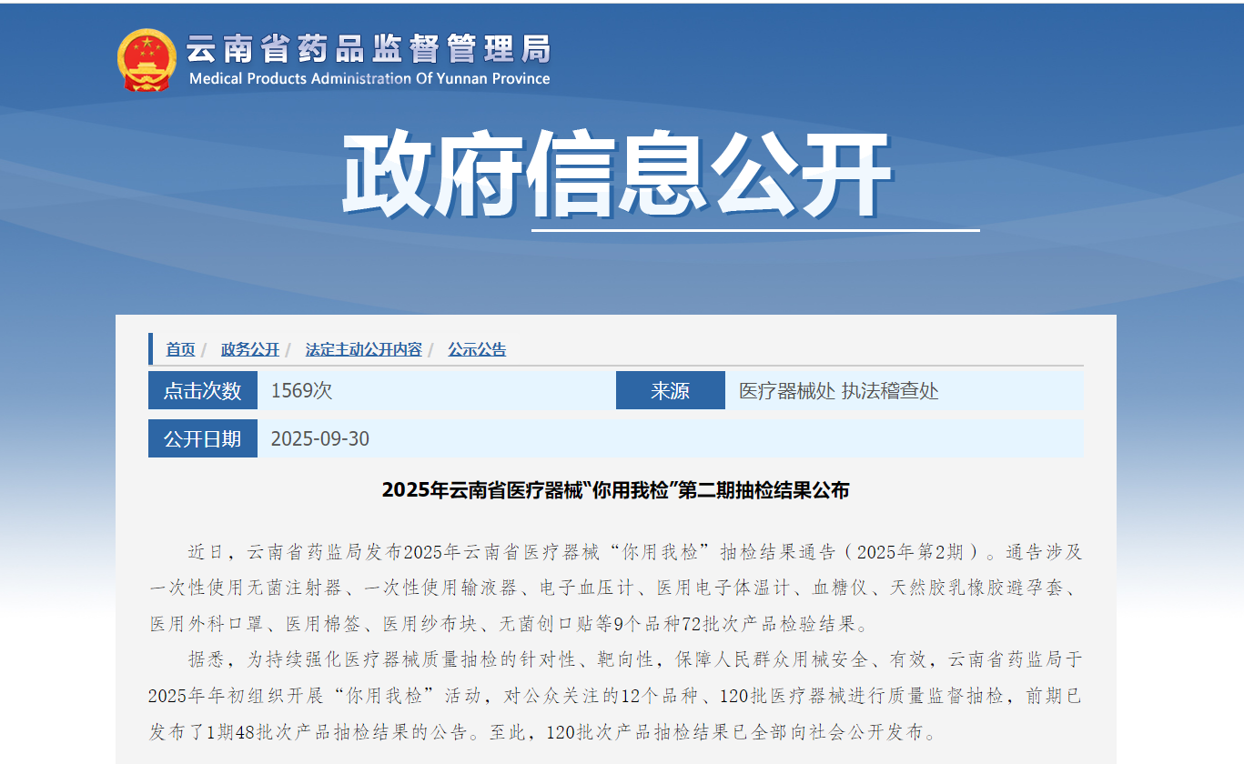 2025年云南省医疗器械“你用我检”第二期抽检结果公布