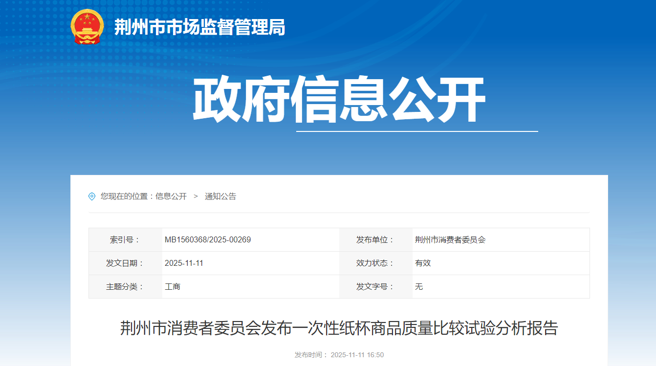 | 索号 号: | MB1560368/2025-00269 | 发布单位: | 荆州市消费者委员会 | | --- | --- | --- | --- | | 发文日期: | 2025-11-11 | 效力状态: | 有效 | | 主题分类: | 工商 | 发文字号: | 元 | 本次试验样品采集覆盖本市核心消费场景,重点选取经开区、沙市区、荆州区三大区域的流通领域,具体包括超市、便利店等与消费者日常采购密切相 关的销售渠道,全面反映市售纸材质食品相关产品质量状况。 中国质量新闻网讯 近日,湖北省荆州市消费者委员会发布一次性纸杯商品质量比较试验分析报告。 附原文: 荆州市消费者委员会 一次性纸杯商品质量比较试验分析报告 为切实保障消费者饮食安全,规范纸材质食品相关产品市场秩序,2025年9月,荆州市消费者委员会依据《中华人民共和国消费者权益保护法》《湖北 省消费者权益保护条例》相关规定,参照纸材质食品相关产品现行国家标准,委托具备法定检测资质的湖北省产品质量监督检验研究院荆州分院,对本市流 通领域销售的一次性纸杯开展专项比较试验。本次试验聚焦产品安全性能与使用性能,通过科学检测与数据分析,旨在为消费者提供客 ...