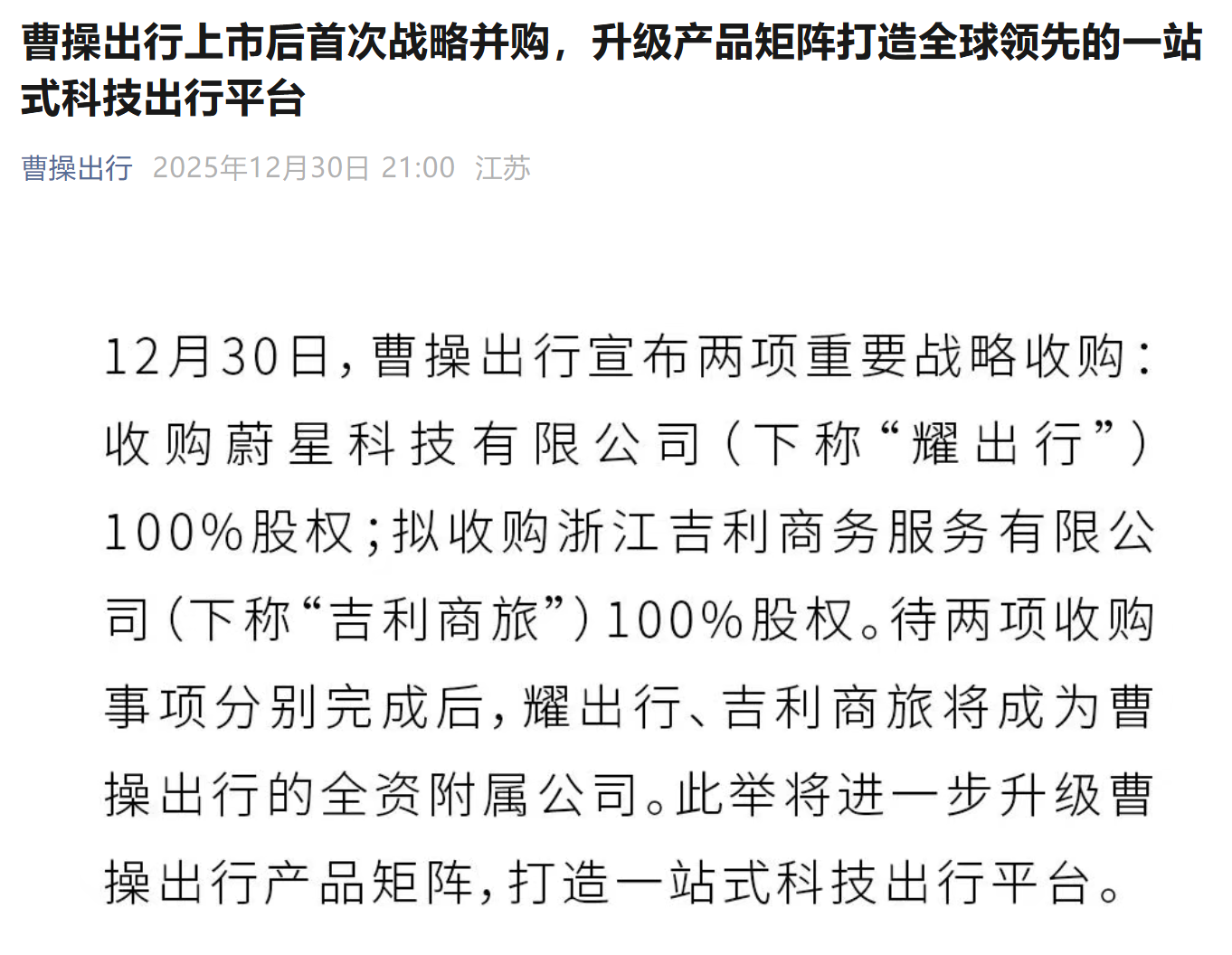 每经AI快讯,12月30日晚,曹操出行官微宣布两项重要战略收购:收购耀出行100%股权,拟收购吉利商旅100%股权。待两项收购事项分别完成后,耀出 行、吉利商旅将成为曹操出行的全资附属公司。完成整合后,耀出行、吉利商旅将借助曹操出行的平台势能,持续为现有客户提供优质服务。曹操出行将在 企业服务端释放协同效应,形成覆盖个人与企业、"出行+商旅"的一站式科技出行平台,为企业客户提供一站式出行和商旅服务。 ...