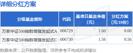 证券之星消息,1月8日发布《万家中证500指数增强型发起式证券投资基金分红公告》。2025年第1次分 红。公告显示,本次分红的收益分配基准日为12月12日,详细分红方案如下: 以上内容为证券之星据公开信息整理,由AI算法生成(网信算备310104345710301240019号),不构成 投资建议。 本次分红对象为权益登记日在万家基金管理有限公司登记在册的本基金全体份额持有人,权益登记日为 1月12日,现金红利发放日为1月14日。选择红利再投资方式的投资者,注册登记机构将以2026年1月12 日除息后的基金份额净值为基准计算其再投资所得的基金份额,并将于2026年1月13日直接计入其基金 账户,2026年1月14日起可以查询、赎回根据财政部、国家税务总局财税字[2002]128号《关于开放式证 券投资基金有关税收问题的通知》,基金向投资者分配的基金收益,暂免征收所得税本基金本次分红免 收分红手续费和红利再投资费用 | 万家中证500指数增强发起式A 006729 | | | 1.60 | | 0.60 | | --- | --- | --- | --- | --- | --- | | 分级基金简称 万家中证5 ...