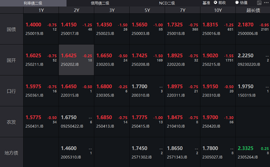 银行间主要利率债收益率全线下行,截至下午16:30,10年期国债活跃券250016收益率下行1.25bp报 1.8315%,30年期国债活跃券2500006收益率下行0.95bp报2.187%,10年期国开活跃券250215收益率下行 1.55bp报1.902%。 | | 利率德二级 信用债二级 NCD二级 NCD二级 | | | 基准 ● 前收 ● 估值 用 … | | | | --- | --- | --- | --- | --- | --- | --- | | | 1Y 100 2Y 2Y 2Y 2Y 3Y 3Y 3Y 3Y 3Y 100 7Y 100 100 100 100 100 | | 超长债 | | | | | | 1.4000 -0.75 1.4150 -1.25 1.4350 -1.50 1.5650 -1.00 1.7325 -0.75 1.8315 -1.25 2.1870 -0.95 | | | | | | | 国债 | 250019.08 250017.18 250023.18 250003.18 250003.18 250018.18 250016.18 2500006.18 | ...