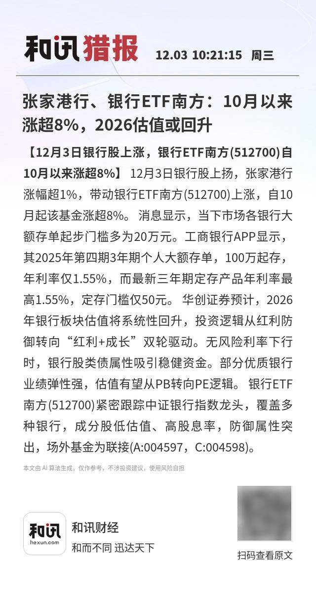 本文由 AI 算法生成,仅作参考,不涉投资建议,使用风险自担 种银行,成分股低估值、高股息率,防御属性突 出,场外基金为联接(A:004597,C:004598)。 【12月3日银行股上涨,银行ETF南方(512700)自10月以来涨超8%】12月3日银行股上扬,张家港行涨 幅超1%,带动银行ETF南方(512700)上涨,自10月起该基金涨超8%。 消息显示,当下市场各银行大额 存单起步门槛多为20万元。工商银行APP显示,其2025年第四期3年期个人大额存单,100万起存,年利 率仅1.55%,而最新三年期定存产品年利率最高1.55%,定存门槛仅50元。 华创证券预计,2026年银行 板块估值将系统性回升,投资逻辑从红利防御转向"红利+成长"双轮驱动。无风险利率下行时,银行股 类债属性吸引稳健资金。部分优质银行业绩弹性强,估值有望从PB转向PE逻辑。 银行ETF南方 (512700)紧密跟踪中证银行指数龙头,覆盖多种银行,成分股低估值、高股息率,防御属性突出,场外 基金为联接(A:004597,C:004598)。 本文由 Al 算法生成,仅作参考,不涉投资建议,使用风险自担 和讯财经 和而不同 迅达天下 ...